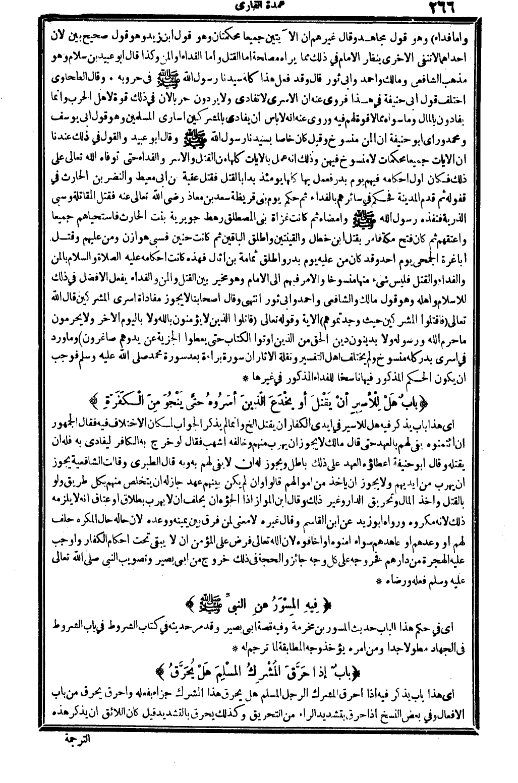 وَقَالَ الطَّحَاوِيّ اخْتلف قَول أبي حنيفَة فِي هَذَا، فَروِيَ عَنهُ: أَن الأسرى لَا تفادى وَلَا يردون حَربًا، لِأَن فِي ذَلِك قُوَّة لأهل الْحَرْب، وَإِنَّمَا يفادون بِالْمَالِ وَمَا سواهُ مِمَّا لَا قُوَّة لَهُم فِيهِ، وَرُوِيَ عَنهُ: أَنه لَا بَأْس أَن يفادى بالمشركين أُسَارَى الْمُسلمين، وَهُوَ قَول أبي يُوسُف وَمُحَمّد، وَرَأى أَبُو حنيفَة أَن الْمَنّ مَنْسُوخ، وَقيل: كَانَ خَاصّا بسيدنا رَسُول الله، صلى الله عَلَيْهِ وَسلم، وَقَالَ أَبُو عبيد: وَالْقَوْل فِي ذَلِك عندنَا أَن الْآيَات جَمِيعًا محكمات لَا مَنْسُوخ فِيهِنَّ، وَذَلِكَ أَنه عمل بِالْآيَاتِ كلهَا من الْقَتْل والأسر وَالْفِدَاء حَتَّى توفاه الله تَعَالَى على ذَلِك، فَكَانَ أول أَحْكَامه فيهم يَوْم بدر، فَعمل بهَا كلهَا يَوْمئِذٍ، بَدَأَ بِالْقَتْلِ فَقتل عقبَة بن أبي معيط وَالنضْر بن الْحَارِث فِي قفوله، ثمَّ قدم الْمَدِينَة فَحكم فِي سَائِرهمْ بِالْفِدَاءِ، ثمَّ حكَّم يَوْم بني قُرَيْظَة سعد بن معَاذ، رَضِي الله تَعَالَى عَنهُ، فَقتل الْمُقَاتلَة وسبى الذُّرِّيَّة، فنفذه رَسُول الله، صلى الله عَلَيْهِ وَسلم وأمضاه، ثمَّ كَانَت غزَاة بني المصطلق، رَهْط جوَيْرِية بنت الْحَارِث، فاستحياهم جَمِيعًا وأعتقهم، ثمَّ كَانَ فتح مَكَّة فَأمر بقتل ابْن خطل والقينتين وَأطلق البَاقِينَ، ثمَّ كَانَت حنين فسبى هوَازن وَمن عَلَيْهِم وَقتل أباغرة الجُمَحِي يَوْم أحد وَقد كَانَ منَّ عَلَيْهِ يَوْم بدر، وَأطلق ثُمَامَة بن أَثَال، فَهَذِهِ كَانَت أَحْكَامه، عَلَيْهِ الصَّلَاة وَالسَّلَام، بالمن وَالْفِدَاء وَالْقَتْل، فَلَيْسَ شَيْء مِنْهَا مَنْسُوخا، وَالْأَمر فيهم إِلَى الإِمَام وَهُوَ مُخَيّر بن الْقَتْل والمن وَالْفِدَاء، يفعل الْأَفْضَل فِي ذَلِك لِلْإِسْلَامِ وَأَهله، وَهُوَ قَول مَالك وَالشَّافِعِيّ وَأحمد وَأبي ثَوْر. انْتهى. وَقَالَ أَصْحَابنَا: لَا يجوز مفاداة أسرى الْمُشْركين، قَالَ الله تَعَالَى: {فَاقْتُلُوا الْمُشْركين حِين وَجَدْتُمُوهُمْ} (التَّوْبَة: 5) . الْآيَة. وَقَوله تَعَالَى: {قَاتلُوا الَّذين لَا يُؤمنُونَ بِاللَّه وَلَا بِالْيَوْمِ الآخر وَلَا يحرمُونَ مَا حرم الله وَرَسُوله وَلَا يدينون دين الْحق من الَّذين أُوتُوا الْكتاب حَتَّى يُعْطوا الْجِزْيَة عَن يدٍ وهم صاغرون} (التَّوْبَة: 92) . وَمَا ورد فِي أسرى بدر كُله مَنْسُوخ، وَلم يخْتَلف أهل التَّفْسِير ونقلة الْآثَار أَن سُورَة بَرَاءَة بعد سُورَة مُحَمَّد، صلى الله عَلَيْهِ وَسلم، فَوَجَبَ أَن يكون الحكم الْمَذْكُور فِيهَا نَاسِخا للْفِدَاء الْمَذْكُور فِي غَيرهَا.