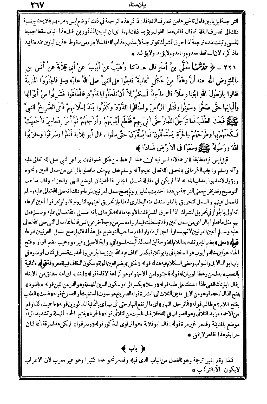 8103 - حدَّثنا مُعَلَّى بنُ أسَدٍ قَالَ حدَّثنا وُهَيْبٌ عنْ أيُّوبَ عنْ أبِي قِلابَةَ عنْ أنَس بنِ مالِكٍ رَضِي الله تَعَالَى عَنهُ أنَّ رهْطاً مِنْ عُكْلٍ ثَمانِيَةً قَدِمُوا علَى النَّبِيِّ صلى الله عَلَيْهِ وَسلم فاجْتَوَوُا المَدِينَةَ فَقَالُوا يَا رسولَ الله ابْغِنا رِسْلاً قَالَ مَا أجِدُ لَكُمْ إلاَّ أنْ تَلْحَقُوا بالذَّوْدِ فانْطَلَقُوا فشَرِبُوا مِنْ أبْوَالِهَا وألْبَانِها حتَّى صَحُّوا وسَمِنُوا وقتَلُوا الرَّاعِيَ واسْتَاقُوا الذَّوْدَ وكَفَرُوا بَعْدَ إسْلاَمِهِمْ فأتَى الصَّرِيخُ النَّبيَّ صلى الله عَلَيْهِ وَسلم فبَعَثَ الطَّلَبَ فَما تَرَجَّلَ النَّهَارُ حتَّى أُتِيَ بِهِمْ فَقَطَّعَ أيْدِيَهُمْ وأرْجُلَهُمْ ثُمَّ أمَرَ بِمَسامِيرَ فأُحْمِيَتْ فَكَحَلَهُمْ بِها وطَرَحَهُمْ بالحَرَّةِ يَسْتَسْقُونَ فَما يُسْقَوْنَ حتَّى ماتُوا. قَالَ أَبُو قِلابَة قَتَلُوا وسَرَقُو وحارَبُوا الله ورَسُولَهُ صلى الله عَلَيْهِ وَسلم وسَعَوْا فِي الأرْضِ فَسادَاً..