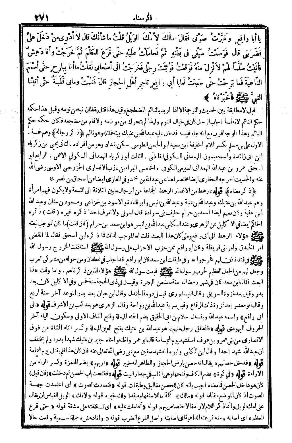 يَا أبَا رَافِعٍ فأجَابَنِي فتَعَمَّدْتُ الصَّوْتَ فضَرَبْتُهُ فَصاحَ فَخَرَجْتُ ثُمَّ جِئْتُ ثُمَّ رَجَعْتُ كأنِّي مُغِيثٌ فقُلْتُ يَا أبَا رَافِعٍ وغَيَّرْتُ صَوْتِي فَقالَ مالَكَ لأمِّكَ الوَيْلُ قُلْتُ مَا شأنُكَ قَالَ لاَ أدْرِي مَنْ دَخَلَ عَلَيَّ فضَرَبَنِي قَالَ فوَضَعْتُ سَيْفِي فِي بَطْنِهِ ثُمَّ تَحَامَلْتُ علَيْهِ حتَّى قرَعَ العَظْمَ ثُمَّ خَرَجْتُ وَأَنا دَهِشٌ فأتَيْتُ سُلَّماً لَهُمْ لأنْزِلَ مِنْهُ فوَقَعْتُ فوُثِئَتْ رِجْلِي فَخَرَجْتُ إلَى أصْحَابِي فَقُلْتُ مَا أنَا بِبَارِحٍ حتَّى أسْمَعَ النَّاعِيَةَ فَمَا بَرِحْتُ حتَّى سَمِعْتُ نَعايا أبِي رَافِعٍ تاجِرِ أهْلِ الحِجَازِ قالَ فَقُمْتُ وَمَا بِي قَلَبَةٌ حتَّى أتَيْنَا النَّبِيَّ صلى الله عَلَيْهِ وَسلم فأخْبَرْنَاهُ..