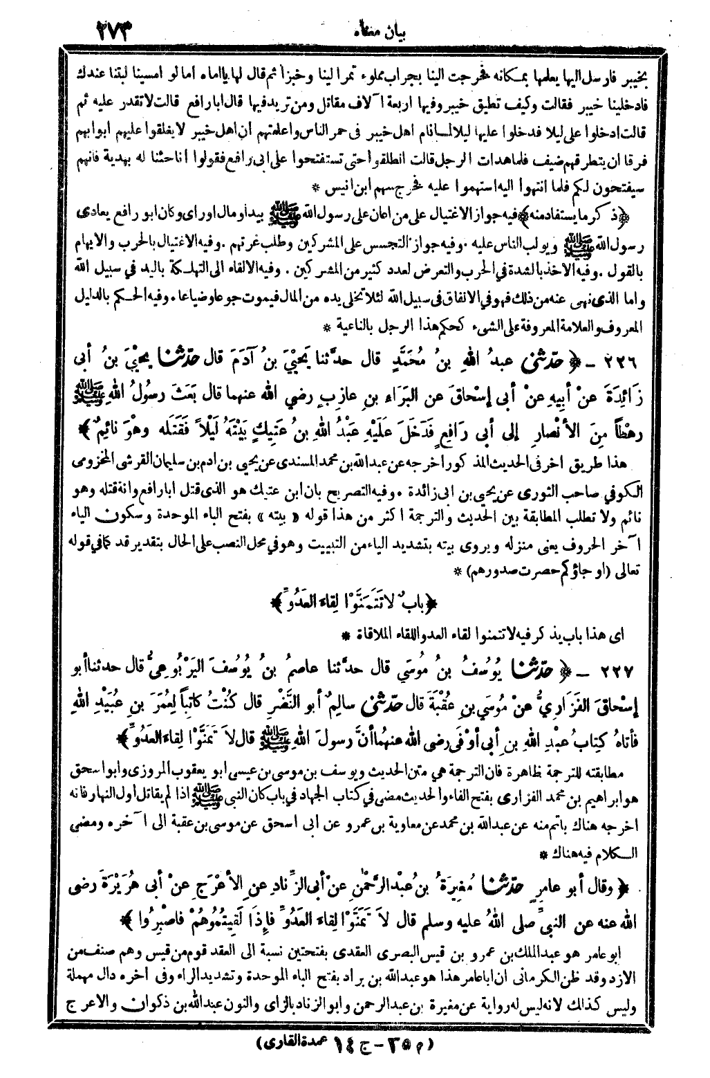 4203 - حدَّثنا يُوسُفُ بنُ مُوسى قَالَ حدَّثنا عاصِمُ بنُ يُوسُفَ اليَرْبُوعِيُّ قَالَ حدَّثنا أبُو إسحَاقَ الفَزَارِيُّ عنْ مُوسَى بنِ عُقْبَةَ قَالَ حدَّثني سالِمٌ أَبُو النَّضْرِ قَالَ كُنْتُ كاتِباً لِعُمَرَ بنِ عُبَيْدِ الله فأتاهُ كِتابُ عَبْدِ الله بنِ أبِي أوْفَى رَضِي الله تَعَالَى عنهُما أنَّ رسولَ الله صلى الله عَلَيْهِ وَسلم قَالَ لاَ تَمَنَّوْا لِقاءَ العَدُوِّ..