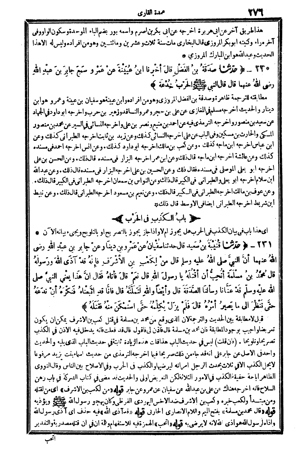 0303 - حدَّثنا صَدَقَةُ بنُ الفَضْلِ قالَ أخْبَرَنا ابنُ عُيَيْنَةَ عنْ عَمْرو سَمِعَ جابِرَ بنَ عَبْدِ الله رَضِي الله تَعَالَى عنهُما قَالَ قَالَ النَّبِي صلى الله عَلَيْهِ وَسلم الحَرْبُ خُدْعَة.