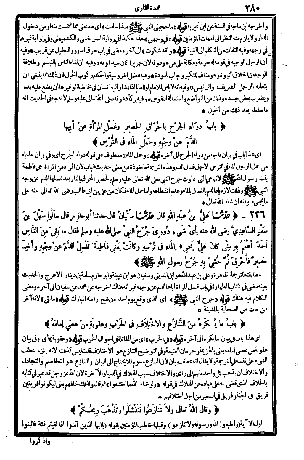 7303 - حدَّثنا عَلِيُّ بنُ عَبْدِ الله قَالَ حدَّثنا سُفْيَانُ قَالَ حدَّثنا أبُو حَازِمٍ قَالَ سألُوا سَهْلَ بْنَ سَعْدٍ السَّاعِدِيَّ رَضِي الله تَعَالَى عنهُ بِأيِّ شَيءٍ دُووِيَ جُرْحُ النَّبِيِّ صلى الله عَلَيْهِ وَسلم فَقَالَ مَا بَقِيَ مِنَ النَّاسِ أحَدٌ أعْلَمُ بِهِ مِنِّي كانَ عَلِيٌّ يَجِيءُ بالْمَاءِ فِي تُرْسِهِ وكانَتْ يَعْنِي فَاطِمَةَ تَغْسِلُ الدَّمَ عنْ وَجْهِهِ وأُخِذَ حَصِيرٌ فأُحْرِقَ ثُمَّ حُشِيَ بِهِ جُرْحُ رسولِ الله صلى الله عَلَيْهِ وَسلم..