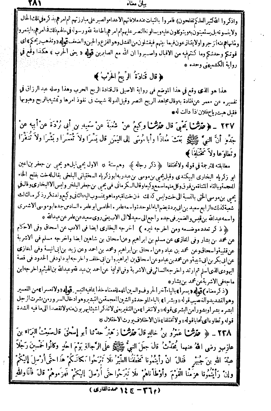 واذْكُرُوا الله كثيرا لَعَلَّكُمْ تفلحون} (الْأَنْفَال: 54) . فَأمروا بالثبات عِنْد ملاقاتهم الْأَعْدَاء، وَالصَّبْر على مبارزتهم، ثمَّ أَمرهم بِذكرِهِ فِي تِلْكَ الْحَال وَلَا ينسونه بل يستعينون بِهِ ويوكلون عَلَيْهِ ويسألونه النَّصْر عَلَيْهِم، ثمَّ أَمرهم بإطاعة الله وَرَسُوله فِي حَالهم ذَلِك، فَمَا أَمرهم بِهِ ايتمروا وَمَا نَهَاهُم عَنهُ انزجروا، وَلَا يتنازعون فِيمَا بَينهم فيفشلون، من الفشل: وَهُوَ الْفَزع والجبن والضعف. قَوْله: {وَتذهب ريحكم} (الْأَنْفَال: 64) . أَي: قوتكم وحدتكم وَمَا كُنْتُم فِيهِ من الإقبال {واصبروا إِن الله مَعَ الصابرين} (الْأَنْفَال: 64) . قَوْله: (يَعْنِي الْحَرْب) ، هَكَذَا وَقع فِي رِوَايَة الْكشميهني وَحده.