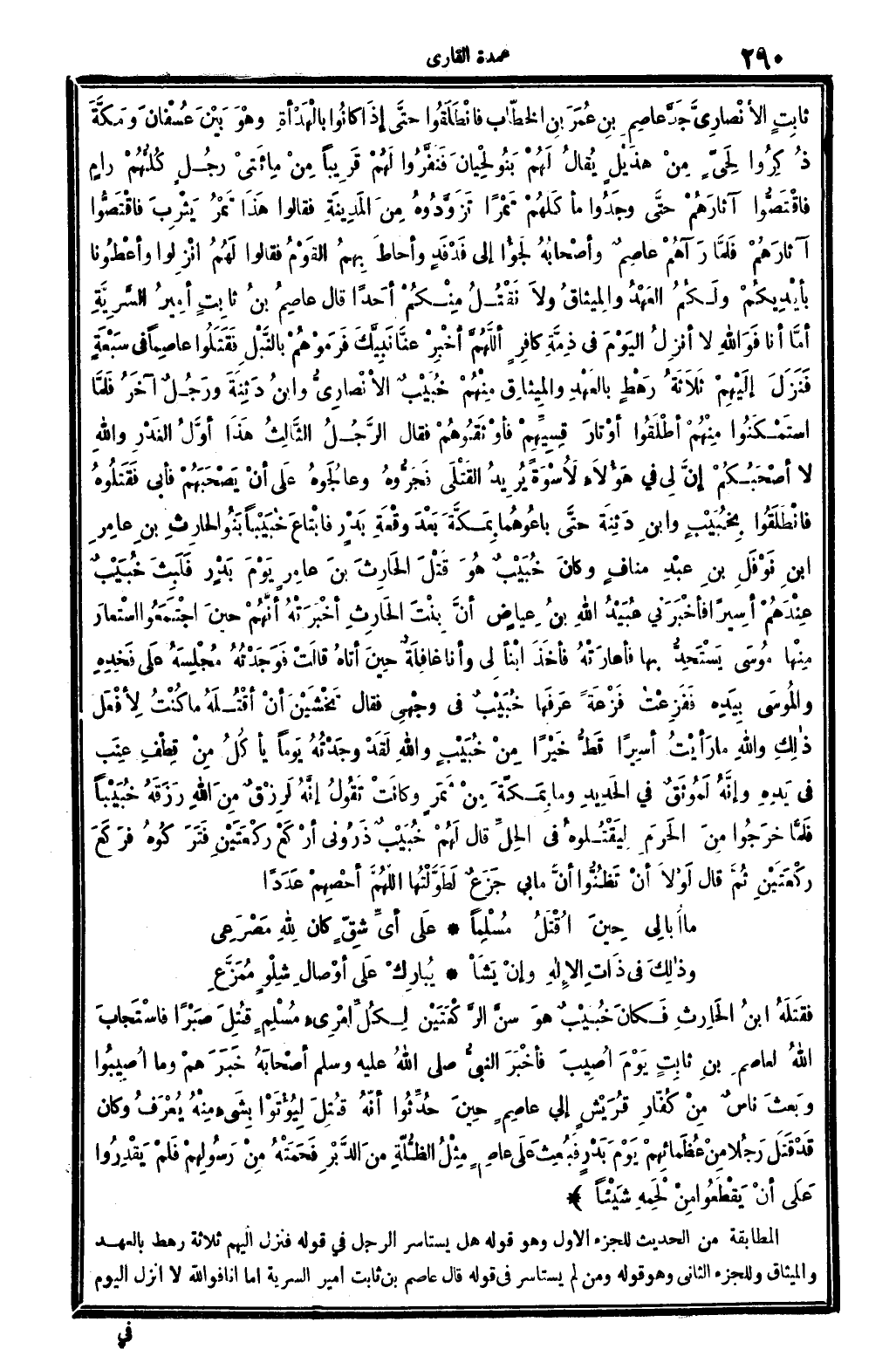 فَقَتَلَهُ ابنُ الحَارِثِ فَكانَ خُبَيْبٌ هوَ سنَّ الرَّكْعَتَيْنِ لِكُلِّ امْرِىءٍ مُسْلِمٍ قُتِلَ صَبْراً فاسْتَجَابَ الله لِعَاصِمِ بنِ ثابِتٍ يَوْمَ أُصِيبَ فأخْبَرَ النَّبِيُّ صلى الله عَلَيْهِ وَسلم أصْحَابَهُ خَبَرَهُمْ وَمَا أُصِيبُوا وبَعثَ ناسٌ مِنْ كُفَّارِ قُرَيْشٍ إِلَى عاصِمٍ حِينَ حُدِّثُوا أنَّهُ قُتِلَ لِيُؤْتَوْا بِشَيْءٍ مِنْهُ يُعْرَفُ وكانَ قَدْ قَتَلَ رَجُلاً مِنْ عُظَمَائِهِمْ يَوْمَ بَدْرٍ فبُعِثَ عَلَى عاصِمً مِثْلُ الظُّلَّةِ مِنَ الدَّبْرِ فَحَمَتْهُ مِنْ رَسُولِهِمْ فَلَمْ يَقْدِرُوا علَى أنْ يَقْطَعُوا مِنْ لَحْمِهِ شَيْئاً..