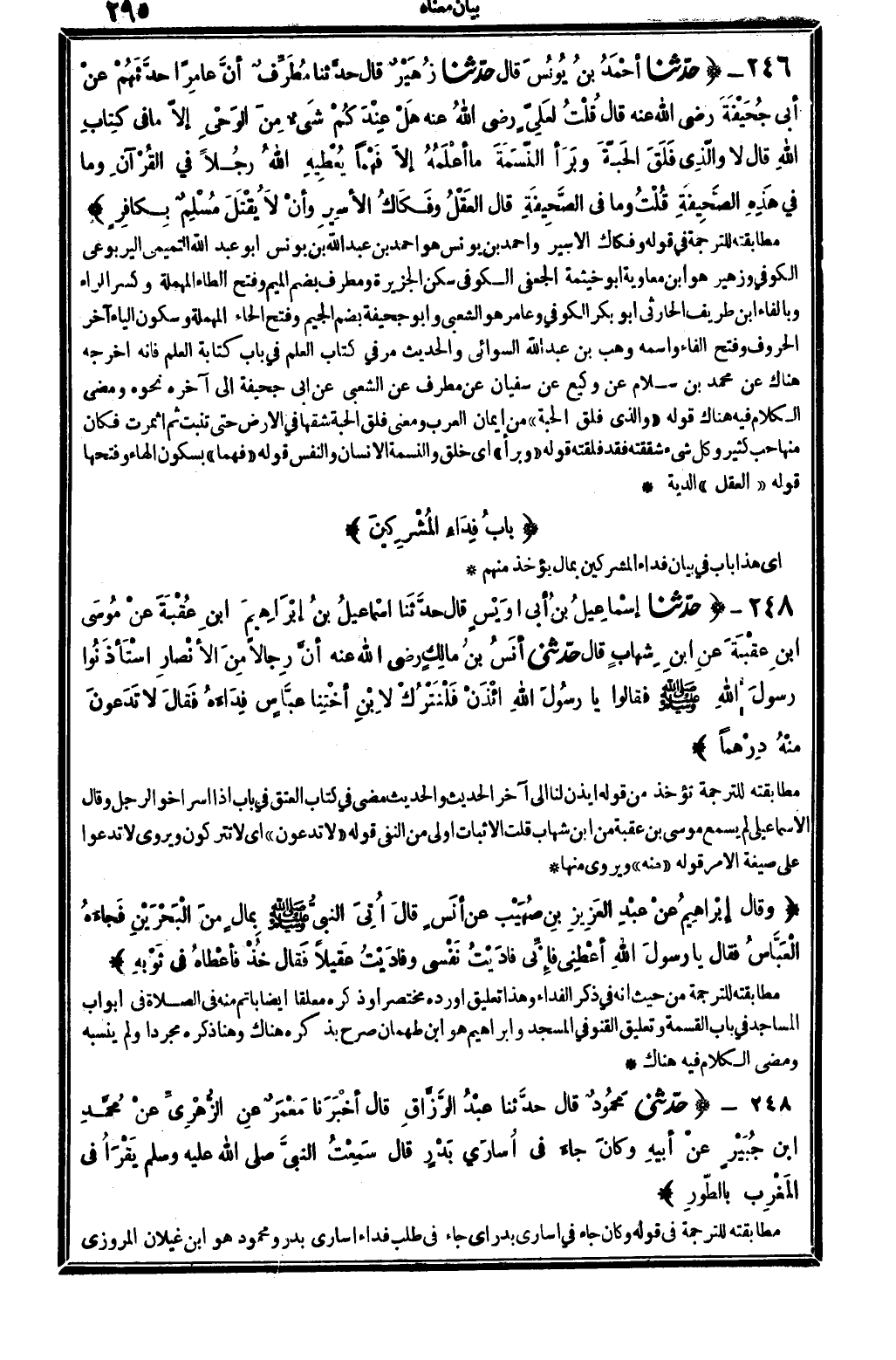 7403 - حدَّثنا أحْمَدُ بنُ يُونُسَ قَالَ حدَّثنا زُهَيْرٌ قَالَ حدَّثنا مُطَرِّفٌ أنَّ عامِرَاً حدَّثَهُمْ عنْ أبِي جُحَيْفَةَ رَضِي الله تَعَالَى عنهُ قَالَ قُلْتُ لِعَلِيٍّ رَضِي الله تَعَالَى عَنهُ هَلْ عِنْدَكُمْ شَيْءٌ مِنَ الوَحْيِ إلاَّ مَا فِي كِتابِ الله قَالَ لَا والَّذِي فَلَقَ الحَبَّةَ وبَرَأ النَّسَمَةَ مَا أعْلَمُهُ إلاَّ فَهْماً يُعْطَيهِ الله رَجُلاً فِي القُرْآنِ وَمَا فِي هَذِهِ الصَّحِيفَةِ قُلْتُ وَمَا فِي الصَّحِيفَةِ قَالَ العَقْلُ وفَكَاكُ الأسِيرِ وأنْ لَا يُقْتَلَ مُسْلِمٌ بِكَافِرٍ..