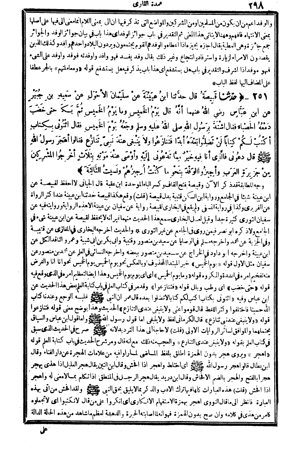 3503 - حدَّثنا قَبِيصَةُ قَالَ حدَّثنا ابنُ عُيَيْنَةَ عنْ سُلَيْمَانَ الأحْوَلِ عنْ سَعِيدِ بنِ جُبَيْرٍ عنِ ابنِ عَبَّاسٍ رَضِي الله تَعَالَى عنهُما أنَّهُ قَالَ يَوْمَ الخَمِيسِ ومَا يَوْمُ الخَمِيسِ ثُمَّ بَكَى حَتَّى خَضَبَ دَمْعُهُ الحَصْبَاءَ فَقَالَ اشْتَدَّ بِرَسُولِ الله صلى الله عَلَيْهِ وَسلم وجَعُهُ يَوْمَ الخَمِيسِ فَقال ائْتُونِي بِكِتَابٍ أكْتُبْ لَكُمْ كِتَابَاً لَنْ تَضِلُّوا بَعْدَهُ أبَدَاً فتَنَازَعُوا ولاَ يَنْبَغِي عِنْدَ نَبِيٍّ تَنازُعَ فَقَالُوا أهَجَرَ رسولُ الله صلى الله عَلَيْهِ وَسلم قَالَ دَعُونِي فالَّذِي أَنا فِيهِ خَيْرٌ مِمَّا تَدْعُونِي إلَيْهِ وأوْصَى عِنْدَ مَوْتِهِ بِثَلاثٍ أخْرِجُوا المُشْرِكِينَ مِنْ جَزِيرَةِ العَرَبِ وأجِيزُوا الوَفْدَ بِنَحْوِ مَا كُنْتُ أُجِيزُهُمْ ونَسِيتُ الثَّالِثَةَ..