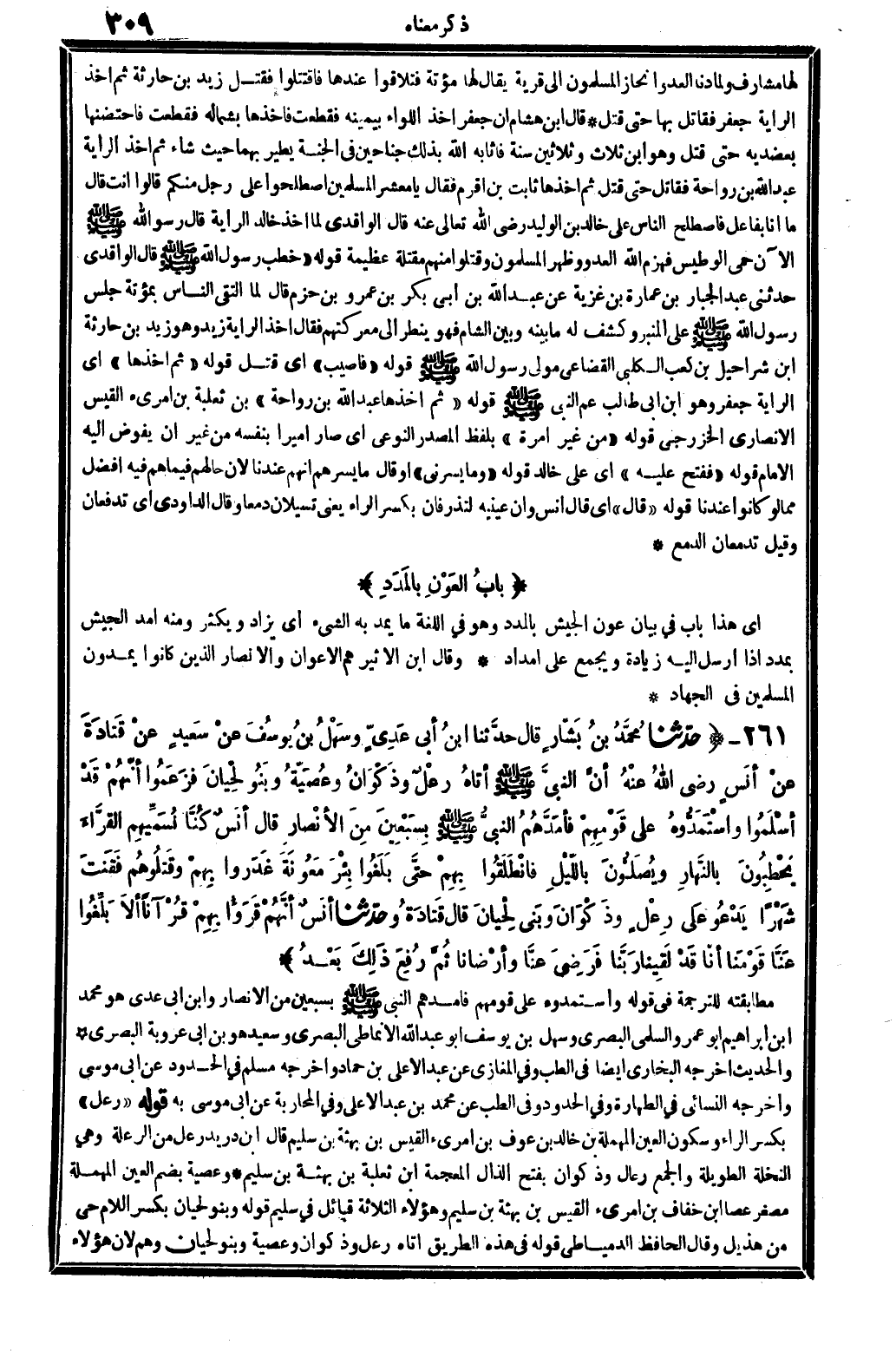 لَهَا: مشارف، وَلما دناالعدو انحاز الْمُسلمُونَ، إِلَى قَرْيَة يُقَال لَهَا: مُؤْتَة، فتلاقوا عِنْدهَا فَاقْتَتلُوا، فَقتل زيد بن حَارِثَة، ثمَّ أَخذ الرَّايَة جَعْفَر فقاتل بهَا حَتَّى قتل. قَالَ ابْن هِشَام: إِن جَعْفَر أَخذ اللِّوَاء بِيَمِينِهِ فَقطعت، فَأَخذهَا بِشمَالِهِ فَقطعت، فاحتضنها بعضديه حَتَّى قتل، وَهُوَ ابْن ثَلَاث وَثَلَاثِينَ سنة، فأثابه الله بذلك جناحين فِي الْجنَّة يطير بهما حَيْثُ شَاءَ، ثمَّ أَخذ الرَّايَة عبد الله بن رَوَاحَة فقاتل حَتَّى قتل، ثمَّ أَخذهَا ثَابت بن أقرم فَقَالَ: يَا معشر الْمُسلمين اصْطَلحُوا على رجل مِنْكُم، قَالُوا: أَنْت! قَالَ مَا أَنا بفاعل، فَاصْطَلَحَ النَّاس على خَالِد بن الْوَلِيد، رَضِي الله تَعَالَى عَنهُ، قَالَ الْوَاقِدِيّ: لما أَخذ خَالِد الرَّايَة قَالَ رَسُول الله، صلى الله عَلَيْهِ وَسلم: الْآن حمى الْوَطِيس، فَهزمَ الله الْعَدو وَظهر الْمُسلمُونَ، وَقتلُوا مِنْهُم مقتلة عَظِيمَة. قَوْله: (خطب رَسُول الله، صلى الله عَلَيْهِ وَسلم) قَالَ الْوَاقِدِيّ: حَدثنِي عبد الْجَبَّار بن عمَارَة بن غزيَّة عَن عبد الله بن أبي بكر بن عَمْرو بن حزم، قَالَ: لما التقى النَّاس بمؤتة جلس رَسُول الله، صلى الله عَلَيْهِ وَسلم على الْمِنْبَر، وكشف لَهُ مَا بَينه وَبَين الشَّام، فَهُوَ ينظر إِلَى معركتهم، فَقَالَ: أَخذ الرَّايَة زيد، وَهُوَ زيد بن حَارِثَة ابْن شرَاحِيل بن كَعْب الْكَلْبِيّ الْقُضَاعِي، مولى رَسُول الله، صلى الله عَلَيْهِ وَسلم. قَوْله: (فأصيب) أَي قتل. قَوْله: (ثمَّ أَخذهَا) ، أَي: الرَّايَة جَعْفَر، وَهُوَ ابْن أبي طَالب عَم النَّبِي صلى الله عَلَيْهِ وَسلم. قَوْله: (ثمَّ أَخذهَا عبد الله بن رَوَاحَة) ، بن ثَعْلَبَة بن امرىء الْقَيْس الْأنْصَارِيّ الخزرجي. قَوْله: (من غير إمرة) ، بِلَفْظ الْمصدر النوعي، أَي: صَار أَمِيرا بِنَفسِهِ من غير أَن يُفَوض إِلَيْهِ الإِمَام. قَوْله: (فَفتح عَلَيْهِ) ، أَي: على خَالِد. قَوْله: (وَمَا يسرني) ، أَو قَالَ: مَا يسرهم أَنهم عندنَا لِأَن حَالهم فِيمَا هم فِيهِ أفضل مِمَّا لَو كَانُوا عندنَا. قَوْله: (قَالَ) أَي: قَالَ أنس: وَإِن عَيْنَيْهِ لتذرفان، بِكَسْر الرَّاء، يَعْنِي: تسيلان دمعاً. وَقَالَ الدَّاودِيّ: أَي: تدفعان وَقيل: تدمعان الدمع.