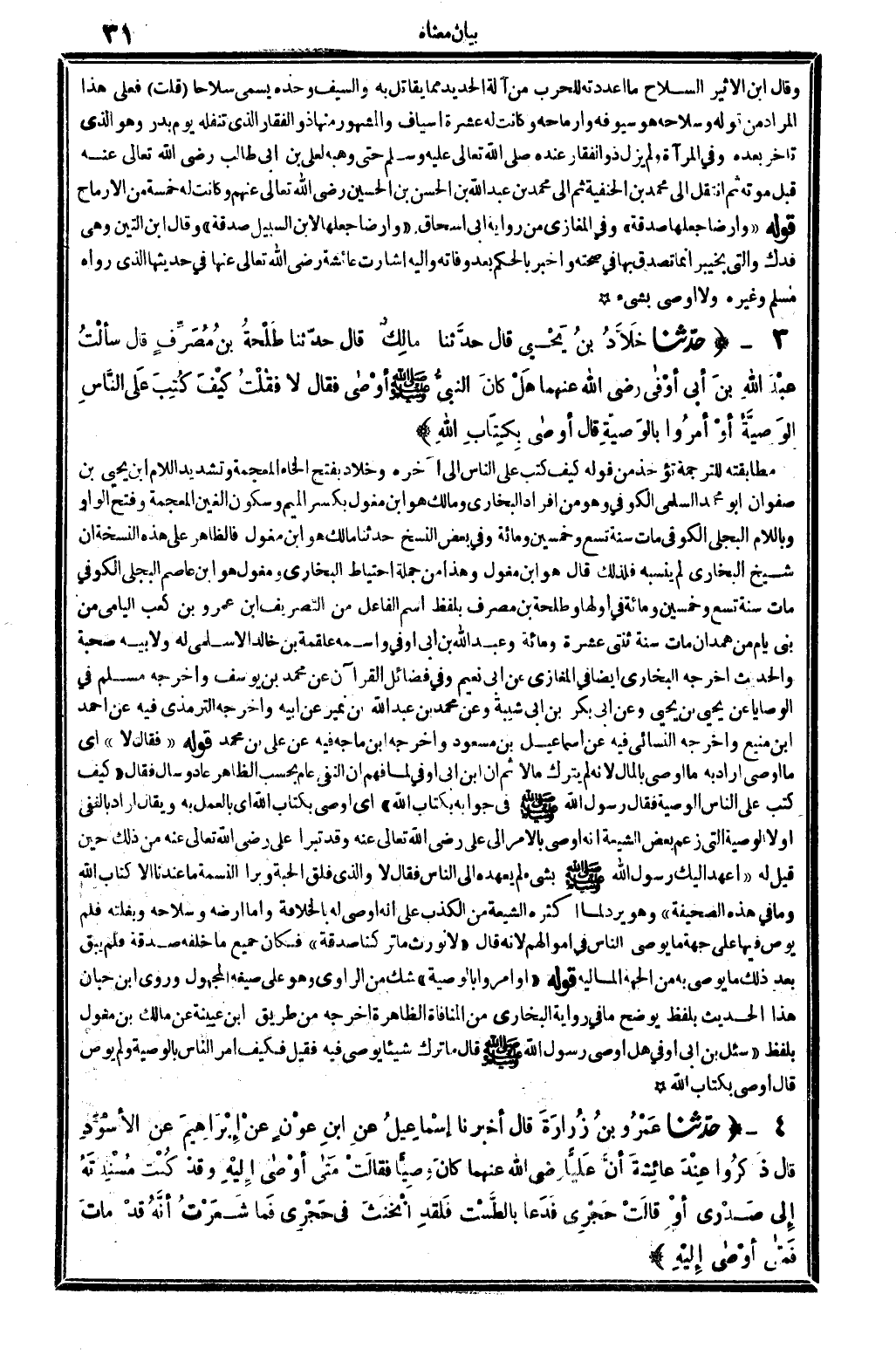 0472 - حدَّثنا خَلاَّدُ بنُ يَحْيى قَالَ حدَّثنا مالِكٌ قَالَ حدَّثنا طَلْحَةُ بنُ مُصَرِّفٍ قَالَ سألْتُ عَبْدَ الله بنَ أبِي أوْفَى رَضِي الله تَعَالَى عنهُما هَلْ كانَ النبيُّ صلى الله عَلَيْهِ وَسلم أوْصاى فَقَالَ لَا فقُلْتُ كَيْفَ كُتِبَ علَى النَّاسِ الوَصِيَّةُ أوْ أُمِرُوا بالوَصِيَّةِ قَالَ أوْصَى بِكِتَابِ الله.