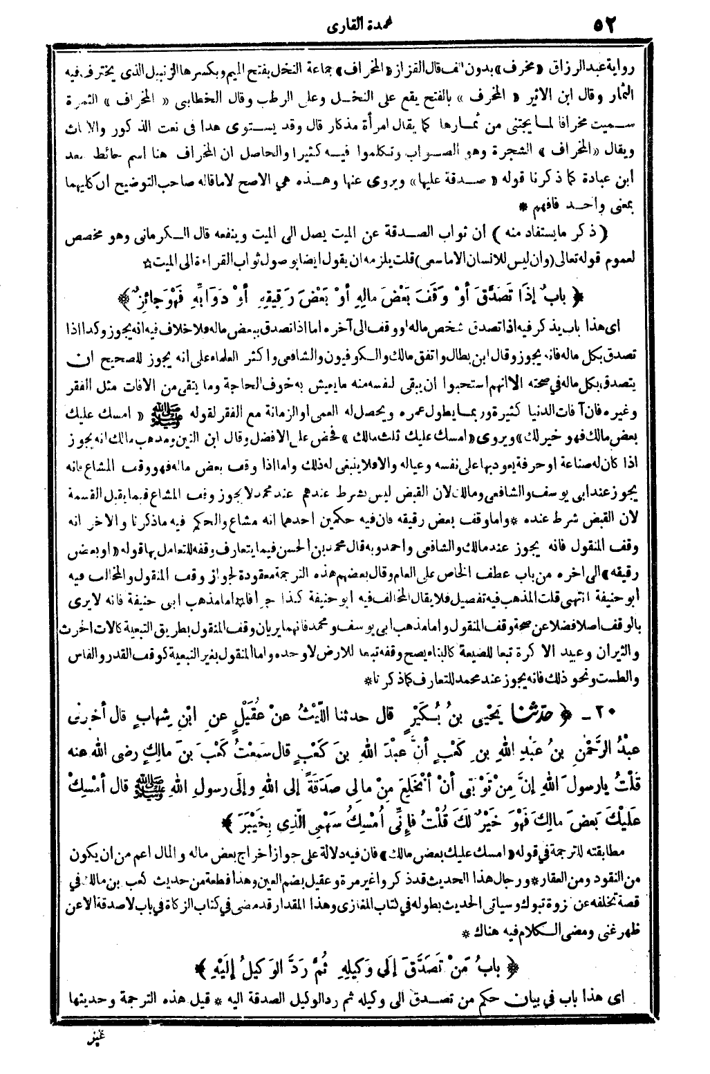 أَي: هَذَا بَاب يذكر فِيهِ إِذا تصدق شخص مَاله ووقف إِلَى آخِره، أما إِذا تصدق بِبَعْض مَاله فَلَا خلاف فِيهِ أَنه يجوز، وَكَذَا إِذا تصدق بِكُل مَاله فَإِنَّهُ يجوز، وَقَالَ ابْن بطال: وَاتفقَ مَالك والكوفيون وَالشَّافِعِيّ وَأكْثر الْعلمَاء على: أَنه يجوز للصحيح أَن يتَصَدَّق بِكُل مَاله فِي صِحَّته، إلاَّ أَنهم استحبوا أَن يبقي لنَفسِهِ مِنْهُ مَا يعِيش بِهِ خوف الْحَاجة، وَمَا يَتَّقِي من الْآفَات مثل الْفقر وَغَيره، فَإِن آفَات الدُّنْيَا كَثِيرَة، وَرُبمَا يطول عمره وَيحصل لَهُ الْعَمى أَو الزمانة مَعَ الْفقر. لقَوْله صلى الله عَلَيْهِ وَسلم: (أمسك عَلَيْك بعض مَالك فَهُوَ خير لَك) ، ويروى: (أمسك عَلَيْك ثلث مَالك) ، فحض على الْأَفْضَل، وَقَالَ ابْن التِّين: وَمذهب مَالك أَنه يجوز إِذا كَانَ لَهُ صناعَة أَو حِرْفَة يعود بهَا على نَفسه وَعِيَاله، وإلاَّ فَلَا يَنْبَغِي لَهُ ذَلِك، وَأما إِذا وقف بعض مَاله فَهُوَ وقف الْمشَاع، فَإِنَّهُ يجوز عِنْد أبي يُوسُف وَالشَّافِعِيّ وَمَالك، لِأَن الْقَبْض لَيْسَ بِشَرْط عِنْدهم، عِنْد مُحَمَّد: لَا يجوز وقف الْمشَاع فِيمَا يقبل الْقِسْمَة، لِأَن الْقَبْض شَرط عِنْده، وَأما وقف بعض رَقِيقه فَإِن فِيهِ حكمين. أَحدهمَا: أَنه مشَاع، وَالْحكم فِيهِ مَا ذكرنَا. وَالْآخر: أَنه وقف الْمَنْقُول، فَإِنَّهُ يجوز عِنْد مَالك وَالشَّافِعِيّ وَأحمد، وَبِه قَالَ مُحَمَّد بن الْحسن فِيمَا يتعارف وَقفه للتعامل بهَا. قَوْله: (أَو بعض رَقِيقه) إِلَى آخِره، من بَاب عطف الْخَاص على الْعَام. وَقَالَ بَعضهم: هَذِه التَّرْجَمَة معقودة لجَوَاز وقف الْمَنْقُول والمخالف فِيهِ أَبُو حنيفَة. انْتهى. قلت: الْمَذْهَب فِيهِ تَفْصِيل فَلَا يُقَال: الْمُخَالف فِيهِ أَبُو حنيفَة، كَذَا جزَافا. أما مَذْهَب أبي حنيفَة فَإِنَّهُ لَا يرى بِالْوَقْفِ أصلا، فضلا عَن صِحَة وقف الْمَنْقُول، وَأما مَذْهَب أبي يُوسُف وَمُحَمّد فَإِنَّهُمَا يريان وقف الْمَنْقُول بطرِيق التّبعِيَّة، كآلات الْحَرْث والثيران، وَعبيد الأكرة تبعا للضيعة كالبناء يَصح وَقفه تبعا للْأَرْض لَا وَحده، وَأما الْمَنْقُول بِغَيْر التّبعِيَّة كوقف الْقدر والفأس والطست وَنَحْو ذَلِك، فَإِنَّهُ يجوز عِنْد مُحَمَّد للتعارف كَمَا ذكرنَا.