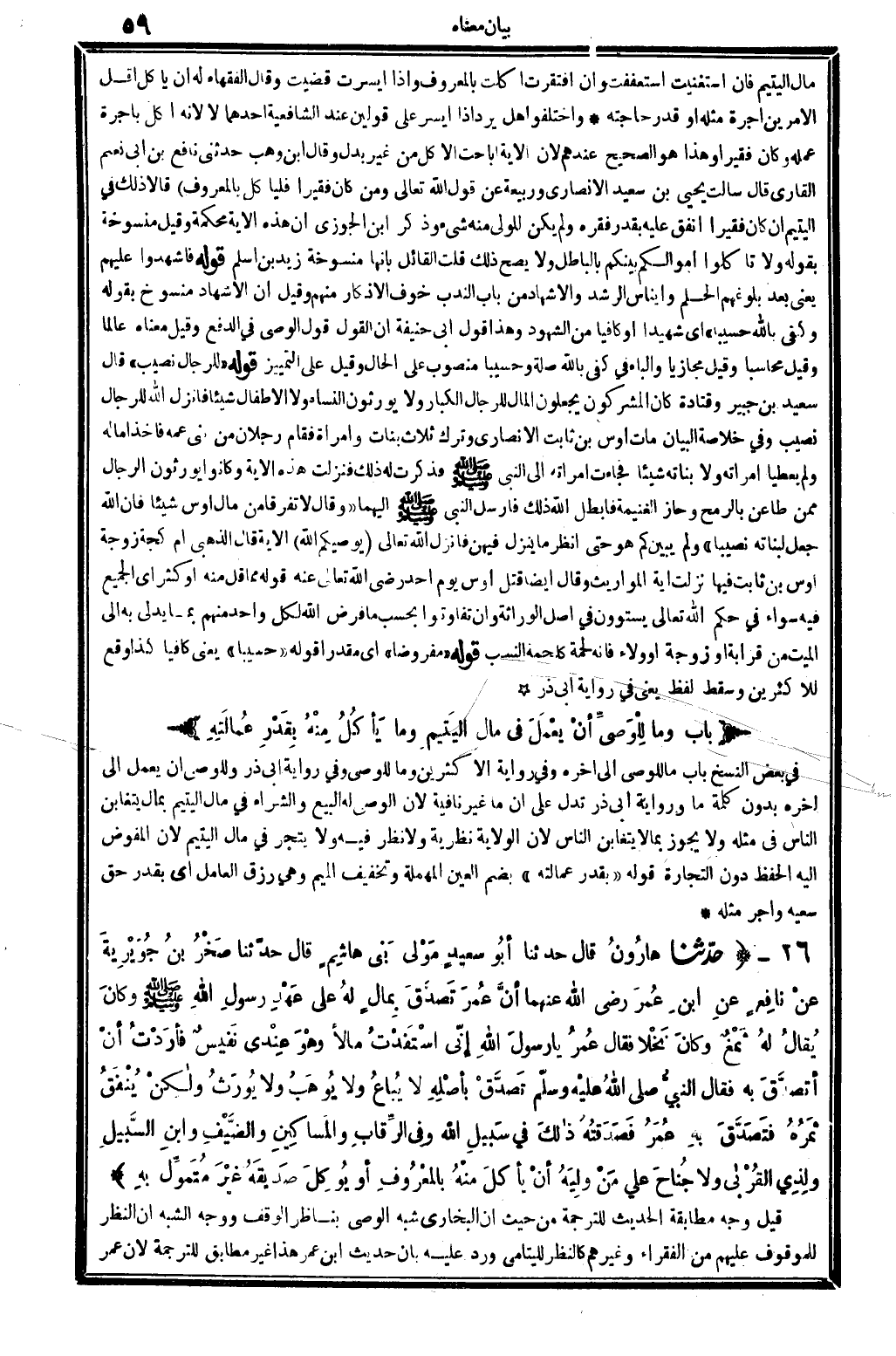 4672 - حدَّثنا هارُونُ قَالَ حدَّثنا أبُو سَعِيدٍ مَوْلَى بَنِي هاشِمٍ قَالَ حدَّثنا صَخْرُ بنُ جُوَيْرِيَةَ عنْ نافِعٍ عنِ ابنِ عُمَرَ رَضِي الله تَعَالَى عنهُما أنَّ عُمَرَ تَصَدَّقَ بِمالٍ لَهُ على عَهْدِ رسولِ الله، صلى الله عَلَيْهِ وَسلم وكانَ يُقالُ لَهُ ثَمْغٌ وكانَ نَخْلاً فقالَ عُمَرُ يَا رسولَ الله إنِّي اسْتَفَدْتُ مَالا وهْوَ عِنْدِي نَفيسٌ فأرَدْتُ أنْ أتَصَدَّقَ بِهِ فَقَالَ النبيُّ صلى الله عَلَيْهِ وَسلم تَصَدَّقَ بأصْلِهِ لَا يُباعُ وَلَا يُوهَبُ وَلَا يُورَثُ ولاكِنْ يُنْفَقُ ثَمرُهُ فتَصَدَّقَ بِهِ عُمَرُ فَصَدَقتُهُ ذالِكَ فِي سَبِيلِ الله وفِي الرِّقَابِ والمَسَاكِينِ والضِّيْفِ وابنِ السَّبِيلِ ولِذِي القُرْباى وَلَا جُنَاحَ عَليّ مَنْ ولِيَهُ أنْ يأكُلَ منْهُ بالمَعْرُوفِ أَو يُوكِلَ صَدِيقَهُ غيْرُ مُتَمَوِّل بِهِ..