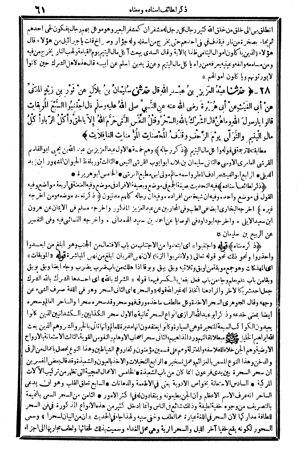 ذكر مَعْنَاهُ: قَوْله: (اجتنبوا) ، أَي: ابتعدوا، من الإجتناب من بَاب الافتعال من الْجنب، وَهُوَ أبلغ من: أبعدوا واحذروا، وَنَحْو ذَلِك. قَوْله تَعَالَى: {وَلَا تقربُوا الزِّنَا} (الْإِسْرَاء: 23) . لِأَن نهي القربان أبلغ من نهي الْمُبَاشرَة. قَوْله: (الموبقات) أَي: المهلكات، وَهُوَ جمع موبقة، من أوبق وثلاثيه: وبق يبْق وبوقاً إِذا هلك من، بَاب: ضرب يضْرب، وَجَاء أَيْضا: وبق يوبق وبقاً، من بَاب: علم يعلم، وَجَاء من بَاب: فعل يفعل بِالْكَسْرِ فيهمَا، قَوْله: (الشّرك بِاللَّه) ، أَي: أَحدهَا: الشّرك بِاللَّه، الشّرك جعل أحد شَرِيكا لآخر، وَالْمرَاد هُنَا: اتِّخَاذ إلَه غير الله. قَوْله: (وَالسحر) أَي: الثَّانِي: السحر، وَهُوَ فِي اللُّغَة: صرف الشَّيْء عَن وَجهه، وَقَالَ الْجَوْهَرِي: السحر الأخذة، وكل مَا لطف مأخذه ورق فَهُوَ سحر، وَقد سحره سحرًا، والساحر الْعَالم، وسحره أَيْضا بِمَعْنى: خدعة، وَذكر أَبُو عبد الله الرَّازِيّ أَنْوَاع السحر ثَمَانِيَة. الأول: سحر الْكَذَّابين والكشدانيين الَّذين كَانُوا يعْبدُونَ الْكَوَاكِب السَّبْعَة الْمُتَحَيِّرَة، وَهِي السيارة، وَكَانُوا يَعْتَقِدُونَ أَنَّهَا مُدبرَة للْعَالم، وَأَنَّهَا تَأتي بِالْخَيرِ وَالشَّر، وهم الَّذين بعث الله إِبْرَاهِيم الْخَلِيل صلى الله عَلَيْهِ وَسلم مُبْطلًا لمقالتهم، وردا لمذاهبهم. الثَّانِي: سحر أَصْحَاب الأوهام والنفوس القوية. الثَّالِث: الِاسْتِعَانَة بالأرواح الأرضية وهم الْجِنّ، خلافًا للفلاسفة والمعتزلة، وهم على قسمَيْنِ: مُؤمنُونَ وكفار، وهم الشَّيَاطِين، وَهَذَا النَّوْع يحصل بأعمال من الرقي والدخن، وَهَذَا النَّوْع الْمُسَمّى بالعزائم وَعمل تسخير. الرَّابِع: التخيلات وَالْأَخْذ بالعيون والشعبذة، وَقد قَالَ بعض الْمُفَسّرين: إِن سحر السَّحَرَة بَين يَدي فِرْعَوْن إِنَّمَا كَانَ من بَاب الشعبذة. الْخَامِس: الْأَعْمَال العجيبة الَّتِي تظهر من تركيب الْآلَات المركبة. السَّادِس: الِاسْتِعَانَة بخواص الْأَدْوِيَة، يَعْنِي: فِي الْأَطْعِمَة والدهانات. السَّابِع: تعلق الْقلب، وَهُوَ أَن يدعى السَّاحر أَنه عرف الإسم الْأَعْظَم، وَأَن الْجِنّ يطيعونه وينقادون لَهُ فِي أَكثر الْأُمُور. الثَّامِن: من السحر: السَّعْي بالنميمة بالتصريف من وُجُوه خُفْيَة لَطِيفَة، وَذَلِكَ شَائِع فِي النَّاس، وَإِنَّمَا أَدخل كثير من هَذِه الْأَنْوَاع الْمَذْكُورَة فِي فن السحر للطافة مداركها، لِأَن السحر فِي اللُّغَة عبارَة عَمَّا لطف وخفي سَببه، وَلِهَذَا جَاءَ فِي الحَدِيث: (إِن من الْبَيَان لسحراً) . وَسمي السّحُور لكَونه يَقع خفِيا آخر اللَّيْل، وَالسحر الرية، وَهِي مَحل الْغَدَاء، وَسميت بذلك لخفائها ولطف مجاريها إِلَى أَجزَاء
