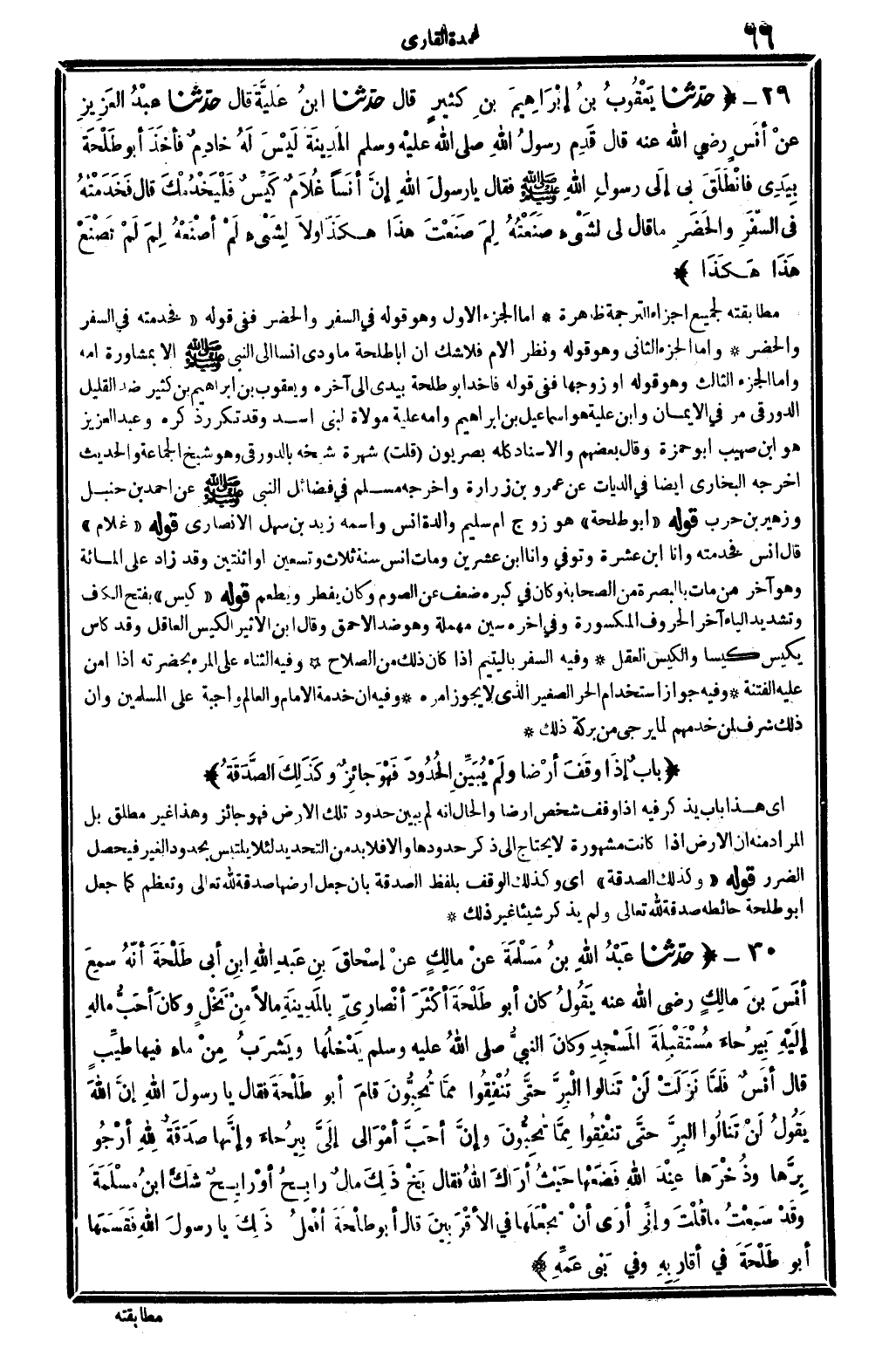 9672 - حدَّثنا عبْدُ الله بنُ مَسْلَمَةَ عنْ مالِكٍ عنْ إسْحَاقَ بنِ عَبْدِ الله ابنِ أبِي طَلْحَةَ أنَّهُ سَمِعَ أنَسَ بنَ مالِكٍ رَضِي الله تَعَالَى عنهُ يَقُولُ كانَ أَبُو طَلْحَةَ أكْثَرَ أنْصَارِيٍّ بالمَدِينَةِ مَالا مِنْ نَخْلٍ وكانَ أحَبُّ مالِهِ إلَيْهُ بِيرُحَاءَ مُسْتَقْبِلَةَ المَسْجِدِ وكانَ النبيُّ صلى الله عَلَيْهِ وَسلم يَدْخُلُها ويَشْرَبُ مِنْ ماءٍ فِيهَا طيِّبٍ قَالَ أنَسٌ فَلَمَّا نَزَلَتْ لَنْ تَنَالُوا الْبِرَّ حتَّى تُنْفِقُوا مِمَّا تُحِبُّونَ قامَ أَبُو طَلْحَةَ فَقَالَ يَا رسولَ الله أنَّ الله يَقُولُ لَنْ تَنَالُوا البِرَّ حتَّى تُنْفِقُوا مِمَّا تُحِبُّونَ وإنَّ أحَبَّ أمْوَالِي إلَيَّ بَيرُحَاءَ وإنَّها صَدَقَةٌ لله أرْجُو بِرَّهَا وذُخْرَها عِنْدَ الله فَضَعْها حَيْثُ أرَاكَ الله فقَال بَخْ ذَلِكَ مالٌ رابِحٌ أوْ رايِحٌ شَكَّ ابنُ مسْلَمَةَ وقَدْ سَمِعْتُ مَا قُلْتَ وإنِّي أرَى أنْ تَجْعَلَها فِي الأقْرَبِينَ قَالَ أبُو طَلْحَةَ أفْعَلُ ذَلِكَ يَا رسولَ الله فقَسَمَها أبُو طَلْحَةَ فِي أقَارِبِهِ وَفِي بَنِي عَمِّهِ.