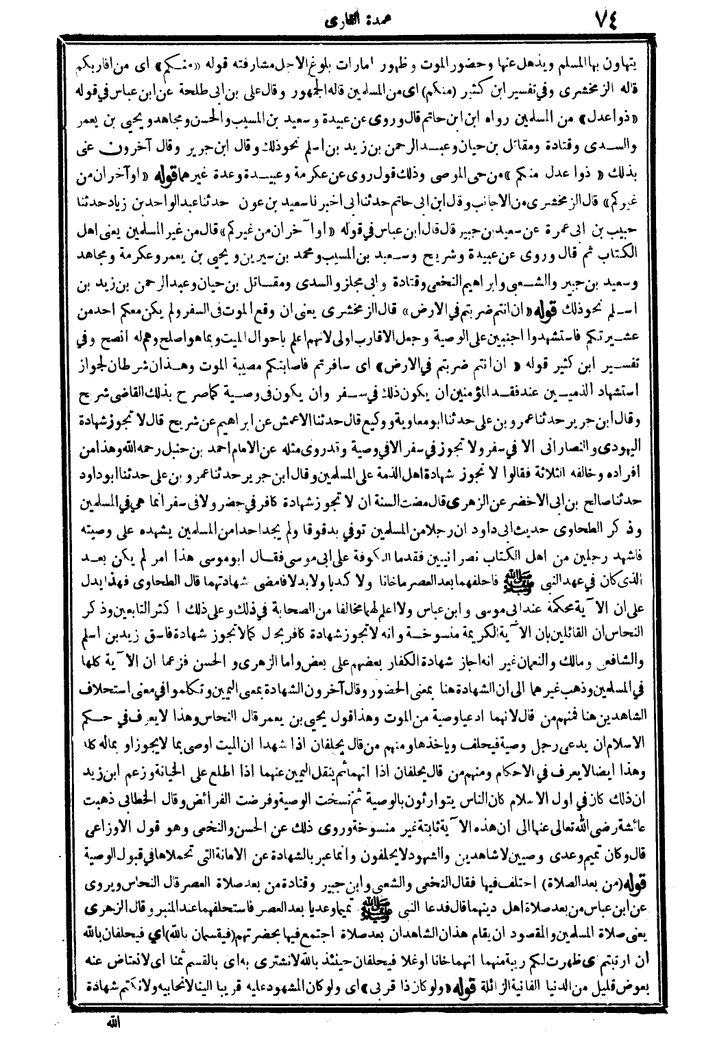 يتهاون بهَا الْمُسلم وَيذْهل عَنْهَا، وَحُضُور الْمَوْت وَظُهُور أَمَارَات بُلُوغ الْأَجَل: مشارفته. قَوْله: (مِنْكُم) أَي: من أقاربكم قَالَه الزَّمَخْشَرِيّ، وَفِي تَفْسِير ابْن كثير: {مِنْكُم} أَي: من الْمُسلمين، قَالَه الْجُمْهُور. وَقَالَ عَليّ بن أبي طَلْحَة: عَن ابْن عَبَّاس فِي قَوْله: (ذَوا عدل) من الْمُسلمين رَوَاهُ ابْن أبي حَاتِم، قَالَ: وروى عَن عُبَيْدَة وَسَعِيد بن الْمسيب وَالْحسن وَمُجاهد وَيحيى بن يعمر وَالسُّديّ وَقَتَادَة وَمُقَاتِل بن حَيَّان وَعبد الرَّحْمَن بن زيد بن أسلم نَحْو ذَلِك، وَقَالَ ابْن جرير: وَقَالَ آخَرُونَ: عَنى بذلك (ذَوا عدل مِنْكُم) من وَحي الْمُوصي، وَذَلِكَ قَول: رُوِيَ عَن عِكْرِمَة وَعبيدَة وعدة غَيرهمَا. قَوْله: (أَو آخرَانِ من غَيْركُمْ) ، قَالَ الزَّمَخْشَرِيّ: من الْأَجَانِب. وَقَالَ ابْن أبي حَاتِم: حَدثنَا أبي أخبرنَا سعيد بن عون حَدثنَا عبد الْوَاحِد بن زِيَاد حَدثنَا حبيب بن أبي عمْرَة عَن سعيد بن جُبَير، قَالَ: قَالَ ابْن عَبَّاس، فِي قَوْله: (أَو آخرَانِ من غَيْركُمْ) قَالَ: من غير الْمُسلمين يَعْنِي: أهل الْكتاب، ثمَّ قَالَ: وروى عَن عُبَيْدَة وَشُرَيْح وَسَعِيد بن الْمسيب وَمُحَمّد بن سِيرِين وَيحيى بن يعمر وَعِكْرِمَة وَمُجاهد وَسَعِيد بن جُبَير وَالشعْبِيّ وَإِبْرَاهِيم النَّخعِيّ وَقَتَادَة وَأبي مجلز وَمُقَاتِل بن حَيَّان وَعبد الرَّحْمَن بن زيد بن أسلم نَحْو ذَلِك. قَوْله: (إِن أَنْتُم ضَرَبْتُمْ فِي الأَرْض) قَالَ الزَّمَخْشَرِيّ: يَعْنِي: إِن وَقع الْمَوْت فِي السّفر وَلم يكن مَعكُمْ أحد من عشيرتكم فاستشهدوا أجنبين على الْوَصِيَّة، وَجعل الْأَقَارِب أولى لأَنهم أعلم بأحوال الْمَيِّت، وَبِمَا هُوَ أصلح، وهم لَهُ أنصح، وَفِي (تَفْسِير ابْن كثير) قَوْله: (إِن أَنْتُم ضَرَبْتُمْ فِي الأَرْض) أَي: سافرتم فأصابتكم مُصِيبَة الْمَوْت، وَهَذَانِ شَرْطَانِ لجَوَاز استشهاد الذميين عِنْد فقد الْمُؤمنِينَ أَن يكون ذَلِك فِي سفر، وَأَن يكون فِي وَصِيَّة، كَمَا صرح بذلك القَاضِي شُرَيْح. وَقَالَ ابْن جرير: حَدثنَا عَمْرو بن عَليّ حَدثنَا أَبُو مُعَاوِيَة ووكيع قَالَ: حَدثنَا الْأَعْمَش عَن إِبْرَاهِيم عَن شُرَيْح قَالَ: لَا تجوز شَهَادَة الْيَهُودِيّ وَالنَّصْرَانِيّ إلاَّ فِي سفر، وَلَا تجوز فِي سفر إلاَّ فِي وَصِيَّة. وَقد روى مثله عَن الإِمَام أَحْمد بن حَنْبَل، رَحمَه الله، وَهَذَا من أَفْرَاده، وَخَالفهُ الثَّلَاثَة فَقَالُوا: لَا تجوز شَهَادَة أهل الذِّمَّة على الْمُسلمين. وَقَالَ ابْن جرير: حَدثنَا عَمْرو بن عَليّ حَدثنَا أَبُو دَاوُد حَدثنَا صَالح بن أبي الْأَخْضَر عَن الزُّهْرِيّ، قَالَ: مَضَت السّنة أَن لَا تجوز شَهَادَة كَافِر فِي حضر وَلَا فِي سفر إِنَّمَا هِيَ فِي الْمُسلمين، وَذكر الطَّحَاوِيّ حَدِيث أبي دَاوُد: أَن رجلا من الْمُسلمين توفّي بدقوقاً وَلم يجد أحدا من الْمُسلمين يشهده على وَصيته، فَأشْهد رجلَيْنِ من أهل الْكتاب نَصْرَانِيين، فَقدما الْكُوفَة على أبي مُوسَى، فَقَالَ أَبُو مُوسَى: هَذَا أَمر لم يكن بعد الَّذِي كَانَ فِي عهد النَّبِي، صلى الله عَلَيْهِ وَسلم، فَأَحْلفهُمَا بعد الْعَصْر: مَا خَانا وَلَا كذبا وَلَا بَدَلا، فَأمْضى شَهَادَتهمَا. قَالَ الطَّحَاوِيّ: فَهَذَا يدل على أَن الْآيَة محكمَة عِنْد أبي مُوسَى وَابْن عَبَّاس، وَلَا أعلم لَهما مُخَالفا من الصَّحَابَة فِي ذَلِك، وعَلى ذَلِك أَكثر التَّابِعين، وَذكر النّحاس: أَن الْقَائِلين بِأَن الْآيَة الْكَرِيمَة مَنْسُوخَة وَأَنه لَا تجوز شَهَادَة كَافِر بِحَال، كَمَا لَا تجوز شَهَادَة فَاسق، زيد بن أسلم وَالشَّافِعِيّ وَمَالك والنعمان، غير أَنه أجَاز شَهَادَة الْكفَّار بَعضهم على بعض، وَأما الزُّهْرِيّ وَالْحسن فزعما أَن الْآيَة كلهَا فِي الْمُسلمين، وَذهب غَيرهمَا إِلَى أَن الشَّهَا