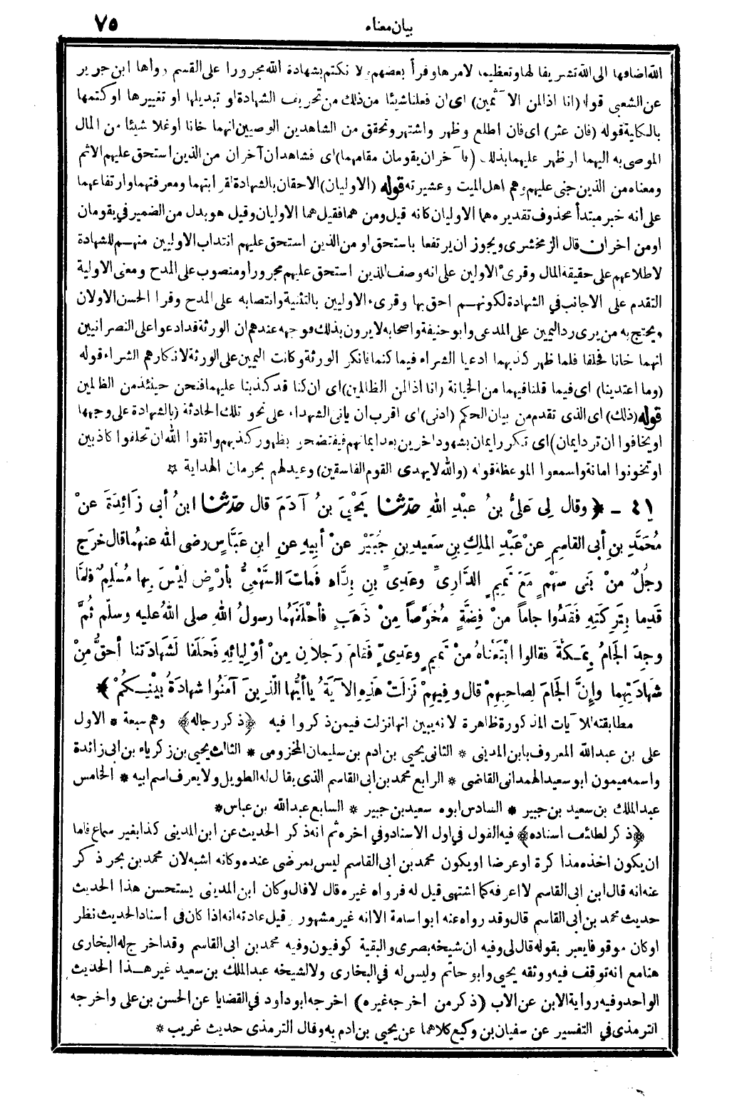 0872 - وَقَالَ لي عَلِيُّ بنُ عبْدِ الله حدَّثنا يَحْيَى بنُ آدَمَ قَالَ حدَّثنا ابنُ أبِي زائِدَةَ عنْ مُحَمَّدِ بنِ أبي القَاسِمِ عنْ عبْدِ المَلِكِ بنِ سَعِيدِ بنِ جُبَيْرٍ عنْ أبِيهِ عنِ ابنِ عَبَّاسٍ رَضِي الله تَعَالَى عنهُما قَالَ خرَجَ رجُلٌ منْ بَنِي سَهْمٍ مَعَ تَمِيمِ الدَّارِيِّ وعَدِيَّ بنِ بِدَّاءٍ فَماتَ السَّهْمِيُّ بِأرْضٍ لَيْسَ بِها مُسْلِمٌ فلَمَّا قدِمَا بِتَرِكَتِهِ فقَدُوا جَاما مِنْ فِضَّةٍ مُخوَّصاً مِنْ ذَهَبٍ فأحْلَفَهُمَا رسولُ الله صلى الله عَلَيْهِ وَسلم ثُمَّ وجِدَ الجَامُ بِمَكَّةَ فقالوُا ابْتَعْنَاهُ منْ تَمِيمٍ وعَدِيٍّ فَقامَ رَجلانِ مِنْ أوْلِيَائِهِ فَحَلَفَا لَشَهَادَتنا أحَقُّ مِنْ شَهَادَتِهِمَا وإنَّ الجَامَ لِصَاحِبِهِمْ قَالَ وفِيهِمْ نَزَلَتْ هَذِهِ الآيَةُ {يَا أيُّهَا الَّذِينَ آمَنُوا شَهَادَةٌ بَيْنَكُمْ} (الْمَائِدَة: 601) .