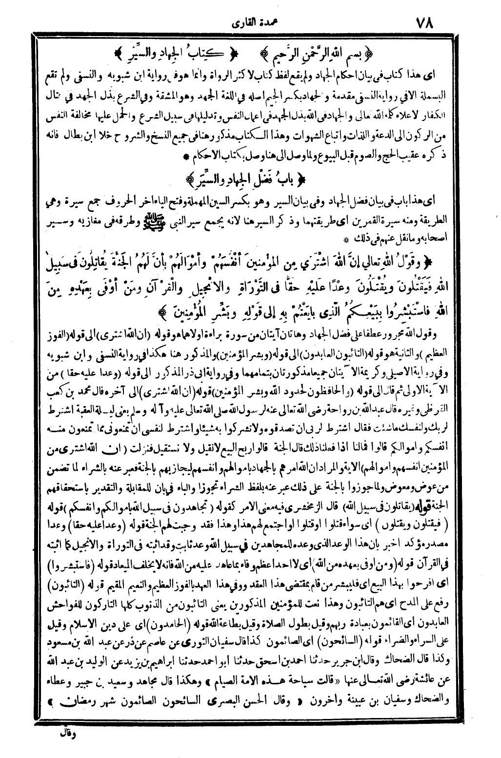 وَقَول الله، مجرور عطفا على فضل الْجِهَاد، وَهَاتَانِ آيتان من سُورَة بَرَاءَة أولاهما هُوَ قَوْله: {إِن الله اشْترى} إِلَى قَوْله: {الْفَوْز الْعَظِيم} (التَّوْبَة: 111) . وَالثَّانيَِة هُوَ قَوْله: {التائبون العابدون} إِلَى قَوْله: {وَبشر الْمُؤمنِينَ} (التَّوْبَة: 211) . وَالْمَذْكُور هُنَا هَكَذَا فِي رِوَايَة النَّسَفِيّ وَابْن شبويه وَفِي رِوَايَة الْأصيلِيّ وكريمة الْآيَتَانِ جَمِيعًا مذكورتان بتمامهما، وَفِي رِوَايَة أبي ذَر الْمَذْكُور إِلَى قَوْله: {وَعدا عَلَيْهِ حَقًا} (التَّوْبَة: 111) . من الْآيَة الأولى ثمَّ قَالَ إِلَى قَوْله: {والحافظون لحدود الله وَبشر الْمُؤمنِينَ} (التَّوْبَة: 21) . قَوْله: {إِن الله اشْترى. .} (التَّوْبَة: 111) . إِلَى آخِره، قَالَ مُحَمَّد بن كَعْب الْقرظِيّ وَغَيره: قَالَ عبد الله بن رَوَاحَة، رَضِي الله تَعَالَى عَنهُ، لرَسُول الله صلى الله عَلَيْهِ وَسلم، يَعْنِي: لَيْلَة الْعقبَة: اشْترط لِرَبِّك وَلِنَفْسِك مَا شِئْت، فَقَالَ: اشْترط لرَبي أَن تُصَدِّقُوهُ وَلَا تُشْرِكُوا بِهِ شَيْئا، وَاشْترط لنَفْسي أَن تَمْنَعُونِي مِمَّا تمْنَعُونَ مِنْهُ أَنفسكُم وَأَمْوَالكُمْ. قَالُوا: فَمَا لنا إِذا فعلنَا ذَلِك؟ قَالَ: الْجنَّة. قَالُوا: ربح البيع، لَا نقِيل وَلَا نَسْتَقِيل، فَنزلت: {إِن الله اشْترى من الْمُؤمنِينَ أنفسهم وَأَمْوَالهمْ} (التَّوْبَة: 111) . الْآيَة، وَالْمرَاد: أَن الله أَمرهم بِالْجِهَادِ بِأَمْوَالِهِمْ وأنفسهم ليجازيهم بِالْجنَّةِ، فَعبر عَنهُ بِالشِّرَاءِ لما تضمن من عوض ومعوض، وَلما جوزوا بِالْجنَّةِ على ذَلِك عبر عَنهُ بِلَفْظ الشِّرَاء تجوزاً، وَالْبَاء فِي: بِأَن، للمقابلة وَالتَّقْدِير باستحقاقهم الْجنَّة. قَوْله: {يُقَاتلُون فِي سَبِيل الله} (التَّوْبَة: 111) . قَالَ الزَّمَخْشَرِيّ: فِيهِ معنى الْأَمر. كَقَوْلِه: {تجاهدون فِي سَبِيل الله بأموالكم وَأَنْفُسكُمْ} (الصَّفّ: 11) . قَوْله: {فيقتلون وَيقْتلُونَ} (التَّوْبَة: 111) . أَي: سَوَاء قَتَلُوا أوْ قُتِلوا أَو اجْتمع لَهُم هَذَا وَهَذَا، فقد وَجَبت لَهُم الْجنَّة. قَوْله: {وَعدا عَلَيْهِ حَقًا} (التَّوْبَة: 111) . وَعدا: مصدر مُؤَكد أخبر بِأَن هَذَا الْوَعْد الَّذِي وعده للمجاهدين فِي سَبِيل الله وعد ثَابت، وَقد أثْبته فِي التَّوْرَاة وَالْإِنْجِيل كَمَا أثْبته فِي الْقُرْآن. قَوْله: {وَمن أوفى بعهده من الله} (التَّوْبَة: 211) . أَي: لَا أحد أعظم وَفَاء بِمَا عَاهَدَ عَلَيْهِ من الله، فَإِنَّهُ لَا يخلف الميعاد. قَوْله: {فاستبشروا} (التَّوْبَة: 111) . أَي: افرحوا بِهَذَا البيع، أَي: فليبشر من قَامَ بِمُقْتَضى هَذَا العقد، ووفى هَذَا الْعَهْد بالفوز الْعَظِيم وَالنَّعِيم الْمُقِيم. قَوْله: {التائبون} (التَّوْبَة: 211) . رفع على الْمَدْح أَي: هم التائبون، وَهَذَا نعت للْمُؤْمِنين الْمَذْكُورين، يَعْنِي: التائبون من الذُّنُوب كلهَا، التاركون للفواحش، {العابدون} (التَّوْبَة: 211) . أَي: القائمون بِعبَادة رَبهم، وَقيل: بطول الصَّلَاة، وَقيل: بِطَاعَة الله. قَوْله: {الحامدون} (التَّوْبَة: 211) . أَي: على دين الْإِسْلَام. وَقيل: على السَّرَّاء وَالضَّرَّاء. قَوْله: {السائحون} (التَّوْبَة: 211) . أَي: الصائمون، كَذَا قَالَ سُفْيَان الثَّوْريّ عَن عَاصِم عَن ذَر عَن عبد الله بن مَسْعُود، وَكَذَا قَالَ الضَّحَّاك، وَقَالَ ابْن جرير: حَدثنَا أَحْمد بن إِسْحَاق حَدثنَا أَبُو أَحْمد حَدثنَا إِبْرَاهِيم بن يزِيد عَن الْوَلِيد بن عبد الله عَن عَائِشَة، رَضِي الله تَعَالَى عَنْهَا، (قَالَت: سياحة هَذِه الْأمة الصّيام) . وَهَكَذَا قَالَ مُجَاهِد وَسَعِيد بن جُبَير وَعَطَاء وَالضَّحَّاك وسُفْيَان بن عُيَيْنَة وَآخَرُونَ، (وَقَالَ الْحسن الْبَصْرِيّ: السائحون الصائمون شهر رَمَضَان) .