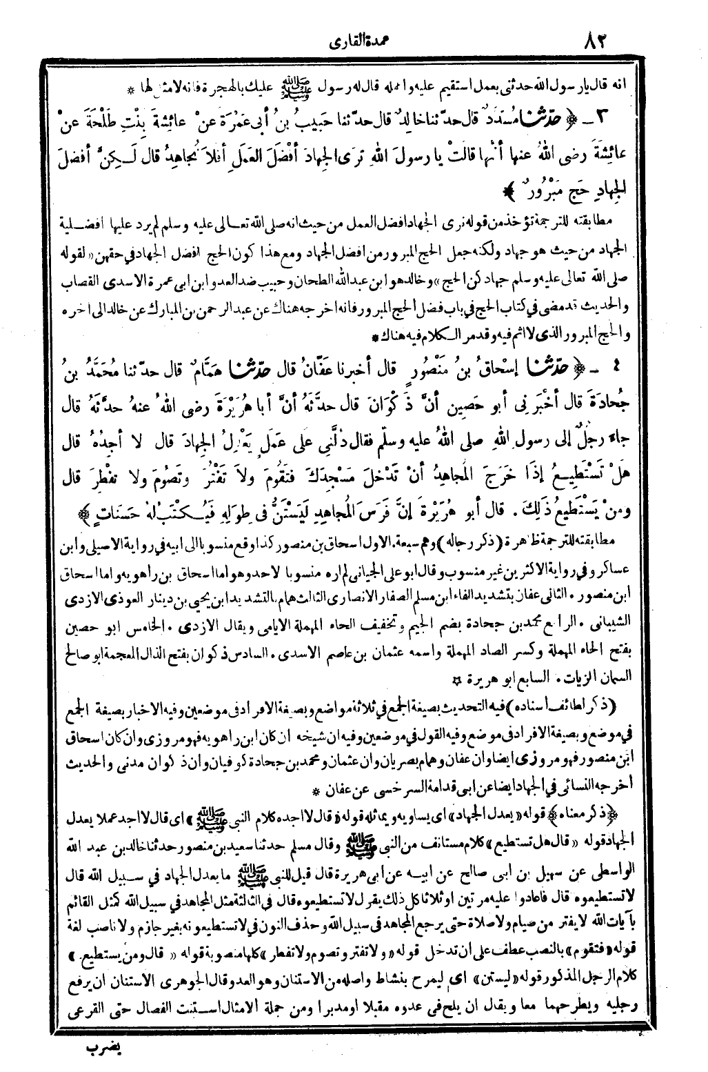 4872 - حدَّثنا مُسَدَّدٌ قَالَ حدَّثنا خالِدٌ قَالَ حدَّثنا حَبيبُ بنُ أبِي عُمْرَةَ عنْ عائِشَةَ بِنْتِ طَلْحَةَ عنْ عائِشَةَ رَضِي الله تَعَالَى عَنْهَا أنَّهَا قالتْ يَا رسولَ الله ترَى الجِهَادَ أفْضَلَ العَمَلِ أفَلاَ نُجَاهِدُ قَالَ لَكِنَّ أفْضلَ الجِهَادِ حَجٌّ مَبْرُورٌ..