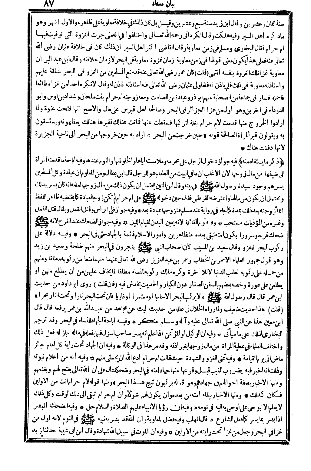 ذكر مَا يُسْتَفَاد مِنْهُ: فِيهِ: جَوَاز دُخُول الرجل على محرمه وملامسته إِيَّاهَا وَالْخلْوَة بهَا، وَالنَّوْم عِنْدهَا. وَفِيه: إِبَاحَة مَا قَدمته الْمَرْأَة إِلَى ضيفها من مَال زَوجهَا، لِأَن الْأَغْلَب أَن مَا فِي الْبَيْت من الطَّعَام هُوَ للرجل، قَالَ ابْن بطال: وَمن الْمَعْلُوم أَن عبَادَة وكل الْمُسلمين يسرهم وجود سيدنَا رَسُول الله، صلى الله عَلَيْهِ وَسلم فِي بَيته، وَقَالَ ابْن التِّين: يحْتَمل أَن يكون ذَلِك من مَال زَوجهَا لعلمه أَنه كَانَ يسر بذلك، وَيحْتَمل أَن يكون من مَالهَا، وَاعْتَرضهُ الْقُرْطُبِيّ فَقَالَ: حِين دُخُوله صلى الله عَلَيْهِ وَسلم على أم حرَام لم تكن زوجا لعبادة، كَمَا يَقْتَضِيهِ ظَاهر اللَّفْظ، إِنَّمَا تزوجته بعد ذَلِك بِمدَّة، كَمَا جَاءَ فِي رِوَايَة عِنْد مُسلم: فَتَزَوجهَا عبَادَة بعد. وَفِيه: جَوَاز فلي الرَّأْس وَقتل الْقمل، وَيُقَال قتل الْقمل وَغَيره من المؤذيات مُسْتَحبّ. وَفِيه: نوم القائلة، لِأَنَّهُ يعين الْبدن لقِيَام اللَّيْل. وَفِيه: جَوَاز الضحك عِنْد الْفَرح، لِأَنَّهُ صلى الله عَلَيْهِ وَسلم ضحك فَرحا وسروراً بِكَوْن أمته تبقى بعده متظاهرين، وَأُمُور الْإِسْلَام قَائِمَة بِالْجِهَادِ حَتَّى فِي الْبَحْر. وَفِيه: دلَالَة على ركُوب الْبَحْر للغزو، وَقَالَ سعيد بن الْمسيب: كَانَ أَصْحَاب النَّبِي، صلى الله عَلَيْهِ وَسلم يتجرون فِي الْبَحْر، مِنْهُم: طَلْحَة وَسَعِيد بن زيد، وَهُوَ قَول جُمْهُور الْعلمَاء إلاَّ عمر بن الْخطاب وَعمر بن عبد الْعَزِيز، رَضِي الله تَعَالَى عَنْهُمَا، فَإِنَّهُمَا منعا من ركُوبه مُطلقًا. وَمِنْهُم من حمله على ركُوبه لطلب الدُّنْيَا لَا للآخرة، وَكره مَالك ركُوبه للنِّسَاء مُطلقًا، لما يخَاف عَلَيْهِنَّ من أَن يطلع مِنْهُنَّ أم يطلعن على عَورَة، وَخَصه بَعضهم بالسفن الصغار دون الْكِبَار، والْحَدِيث يخدش فِيهِ. فَإِن قلت: روى أَبُو دَاوُد من حَدِيث ابْن عمر، قَالَ: قَالَ رَسُول الله، صلى الله عَلَيْهِ وَسلم: (لَا يركب الْبَحْر إلاَّ حَاجا أَو مُعْتَمِرًا أَو غازياً، فَإِن تَحت الْبَحْر نَارا، وَتَحْت النَّار بحراً) . قلت: هَذَا حَدِيث ضَعِيف، وَلما رَوَاهُ الْخلال فِي (علله) من حَدِيث لَيْث عَن مُجَاهِد عَن عبد الله بن عمر يرفعهُ، قَالَ: قَالَ ابْن معِين: هَذَا عَن النَّبِي، صلى الله عَلَيْهِ وَسلم، مُنكر. وَفِيه: إِبَاحَة الْجِهَاد للنِّسَاء فِي الْبَحْر، وَقد ترْجم البُخَارِيّ لذَلِك، على مَا سَيَأْتِي. وَفِيه: أَن الْوَكِيل أَو المؤتمن إِذا علم أَنه يسر صَاحب الْمنزل فِيمَا يَفْعَله فِي مَاله جَازَ لَهُ فعل ذَلِك، وَاخْتلف الْعلمَاء فِي عَطِيَّة الْمَرْأَة من مَال زَوجهَا بِغَيْر إِذْنه، وَقد مر هَذَا فِي الْوكَالَة. وَفِيه: أَن الْجِهَاد تَحت راية كل إِمَام جَائِز ماضٍ إِلَى يَوْم الْقِيَامَة. وَفِيه: تمني الْغَزْو وَالشَّهَادَة حَيْثُ قَالَت أم حرَام: أُدْعُ الله أَن يَجْعَلنِي مِنْهُم. وَفِيه: أَنه من أَعْلَام نبوته وَذَلِكَ أَنه أخبر فِيهِ بضروب الْغَيْب قبل وُقُوعهَا، مِنْهَا: جِهَاد أمته فِي الْبَحْر، وضحكه دَال على أَن الله تَعَالَى يفتح لَهُم ويغنمهم. وَمِنْهَا الْإِخْبَار بِصفة أَحْوَالهم فِي جهادهم، وَهُوَ قَوْله: (يركبون ثبج هَذَا الْبَحْر) ، وَمِنْهَا قَوْله لأم حرَام: أَنْت من الْأَوَّلين، فَكَانَ كَذَلِك. وَمِنْهَا: الْإِخْبَار بِبَقَاء أمته من بعده، وَأَن يكون لَهُم شَوْكَة، وَأَن أم حرَام تبقى إِلَى ذَلِك الْوَقْت، وكل ذَلِك لَا يعلم إلاَّ بِوَحْي عَليّ أُوحِي بِهِ إِلَيْهِ فِي نَومه. وَفِيه: أَن رُؤْيا الْأَنْبِيَاء، عَلَيْهِم الصَّلَاة وَالسَّلَام، حق. وَفِيه: الضحك المبشر إِذا بشر بِمَا يسر، كَمَا فعل الشَّارِع. قَالَ الْمُهلب: وَفِيه: فضل لمعاوية وَأَن الله قد بشر بِهِ نبيه صلى الله عَلَيْهِ وَسلم فِي النّوم، لِأ