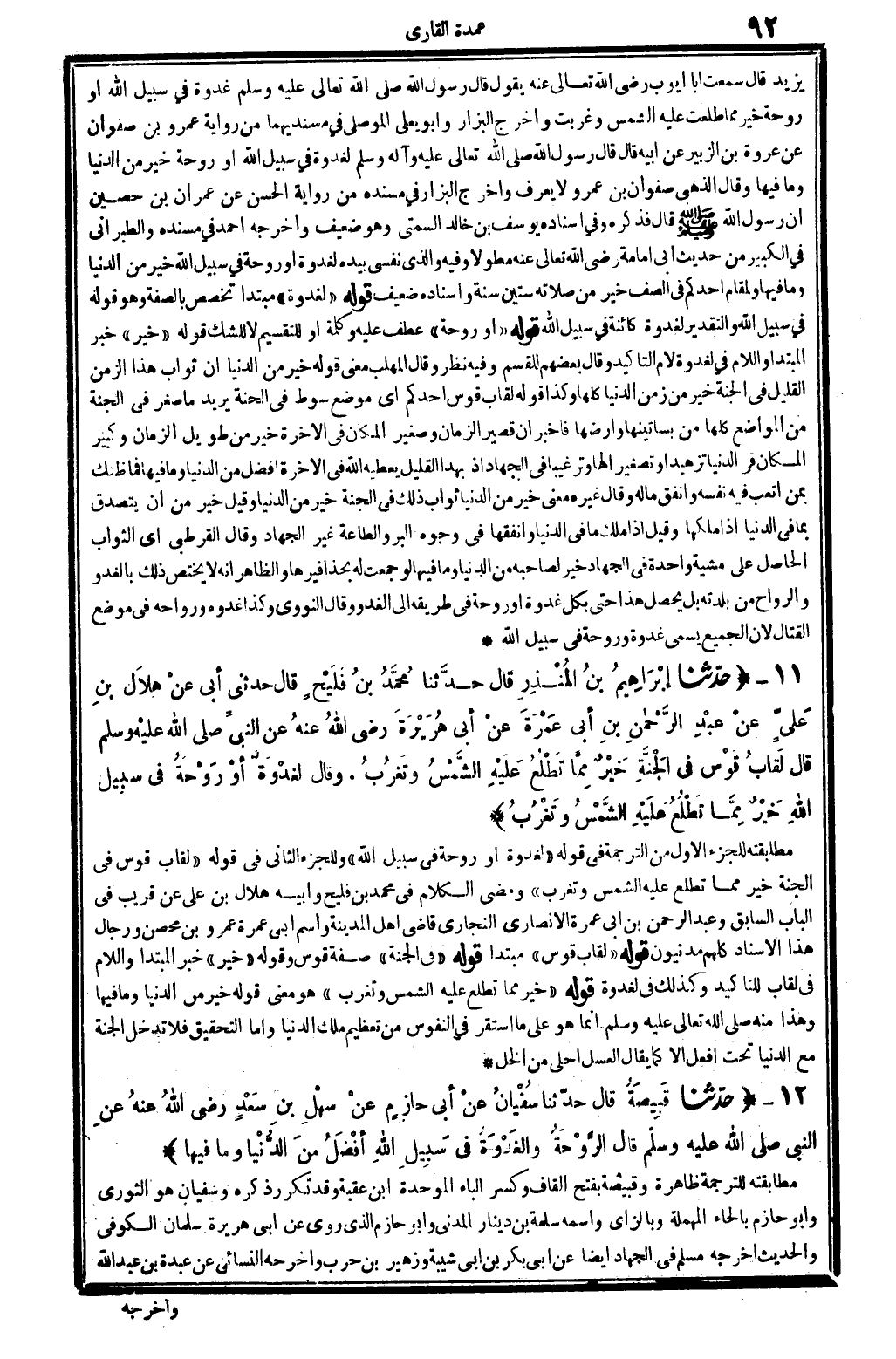 يزِيد، قَالَ: سَمِعت أَبَا أَيُّوب، رَضِي الله تَعَالَى عَنهُ، يَقُول: قَالَ رَسُول الله، صلى الله عَلَيْهِ وَسلم: غدْوَة فِي سَبِيل الله، أَو رَوْحَة خير مِمَّا طلعت عَلَيْهِ الشَّمْس وغربت. وَأخرج الْبَزَّار وإبو يعلى الْموصِلِي فِي (مسنديهما) من رِوَايَة عَمْرو بن صَفْوَان عَن عُرْوَة بن الزبير عَن أَبِيه قَالَ قَالَ رَسُول الله، صلى الله عَلَيْهِ وَسلم: لغدوة فِي سَبِيل الله أَو رَوْحَة خير من الدُّنْيَا وَمَا فِيهَا. وَقَالَ الذَّهَبِيّ: صَفْوَان بن عَمْرو لَا يعرف، وَأخرج الْبَزَّار فِي (مُسْنده) من رِوَايَة الْحسن عَن عمرَان بن حُصَيْن أَن رَسُول الله، صلى الله عَلَيْهِ وَسلم قَالَ ... فَذكره، وَفِي إِسْنَاده يُوسُف بن خَالِد السَّمْتِي وَهُوَ ضَعِيف. وَأخرجه أَحْمد فِي (مُسْنده) وَالطَّبَرَانِيّ فِي (الْكَبِير) من حَدِيث أبي أُمَامَة، رَضِي الله تَعَالَى عَنهُ، مطولا، وَفِيه: وَالَّذِي نَفسِي بِيَدِهِ لغدوة أَو رَوْحَة فِي سَبِيل الله خير من الدُّنْيَا وَمَا فِيهَا، ولمقام أحدكُم فِي الصَّفّ خير من صلَاته سِتِّينَ سنة. وَإِسْنَاده ضَعِيف.