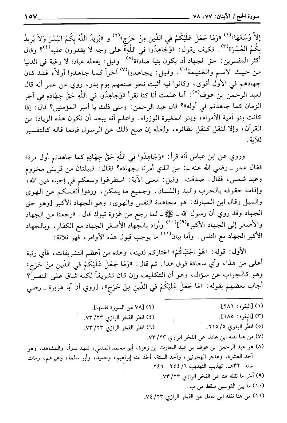 وروي عن ابن عباس أنه قرأ: «وَجَاهِدُوا في اللَّهِ حَقَّ جَهَادِهِ كما جاهدتم أول مرة» فقال عمر - رَضِيَ اللَّهُ عَنْه -: من الذي أمرنا بجهاده؟ فقال: قبيلتان من قريش مخزوم وعبد شمس، فقال: صدقت. وقيل: معنى الآية: استفرغوا وسعكم في إحياء دين الله، وإقامة حقوقه بالحرب واليد واللسان، وجميع ما يمكن، وردوا أنفسكم عن الهوى والميل وقال ابن المبارك: هو مجاهدة النفس والهوى، وهو الجهاد الأكبر [وهو حق الجهاد وقد روي أن رسول الله - صَلَّى اللَّهُ عَلَيْهِ وَسَلَّم َ - لما رجع من غزوة تبوك قال: