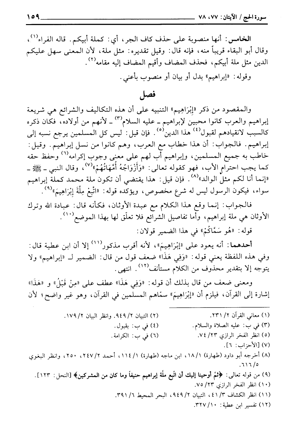 فإن قيل: ليس كل المسلمين يرجع نسبه إلى إبراهيم. فالجواب: أن هذا خطاب مع العرب، وهم كانوا من نسل إبراهيم. وقيل: خاطب به جميع المسلمين، وإبراهيم أب لهم على معنى وجوب إكرامه وحفظ حقه كما يجب احترام الأب، فهو كقوله تعالى: «وَأَزْوَاجُهُ أُمَّهَاتُهُمْ» ، وقال النبي - صَلَّى اللَّهُ عَلَيْهِ وَسَلَّم َ - «إنما أنا لكم مثل الوالد» فإن قيل: هذا يقتضي أن تكون ملة محمد كملة إبراهيم سواء، فيكون الرسول ليس له شرع مخصوص، ويؤكده قوله: {اتبع مِلَّةَ إِبْرَاهِيمَ} [النحل: 123] .