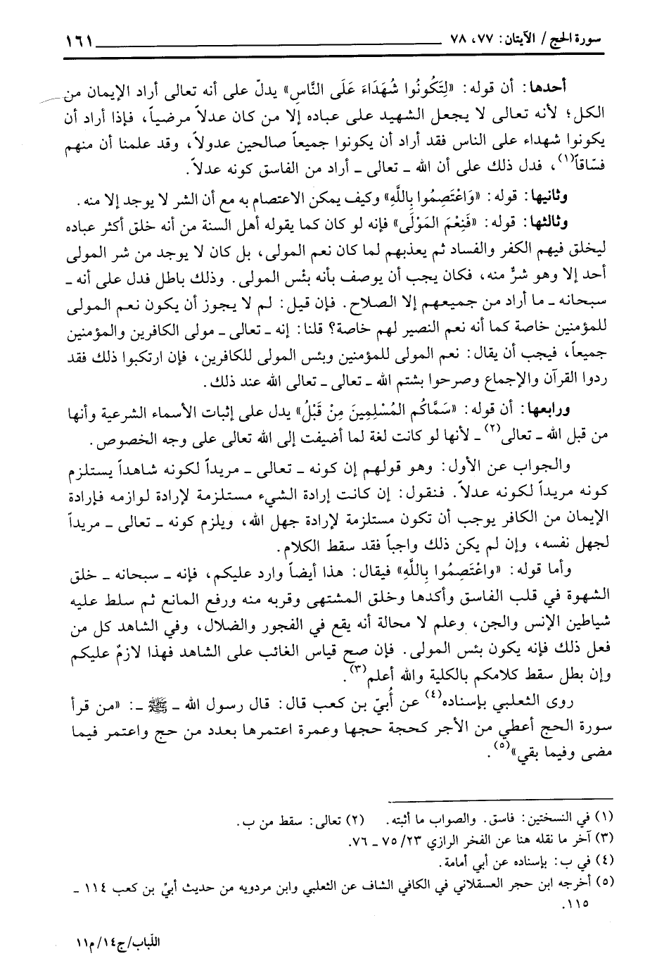 وثالثها: قوله: «فَنِعْمَ المَوْلَى» فإنه لو كان كما يقوله أهل السنة من أنه خلق أكثر عباده ليخلق فيهم الكفر والفساد ثم يعذبهم لما كان نعم المولى، بل كان لا يوجد من شر المولى أحد إلا وهو شرٌّ منه، فكان يجب أن يوصف بأنه بئْس المولى. وذلك باطل فدل على أنه - سبحانه - ما أراد من جميعهم إلا الصلاح. فإن قيل: لم لا يجوز أن يكون نعم المولى للمؤمنين خاصة كما أنه نعم النصير لهم خاصة؟ قلنا: إنه - تعالى - مولى الكافرين والمؤمنين جميعاً، فيجب أن يقال: نعم المولى للمؤمنين وبئس المولى للكافرين، فإن ارتكبوا ذلك فقد ردوا القرآن والإجماع وصرحوا بشتم الله - تعالى - تعالى الله عند ذلك.