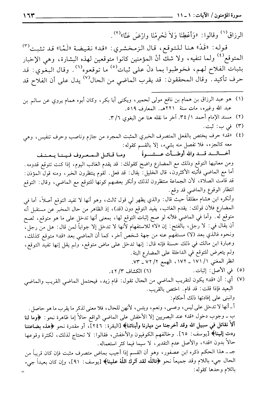 قوله: «قَدْ» هنا للتوقع، قال الزمخشري: «قد» نقيضة «لَمَّا» قد تثبت المتوقع ولما تنفيه، ولا شك أنّ المؤمنين كانوا متوقعين لهذه البشارة، وهي الإخبار بثبات الفلاح لهم، فخوطبوا بما دلّ على ثبات ما توقعوه. وقال البغوي: قد حرف تأكيد. وقال المحققون: قد يقرب الماضي من الحال يدل على أن الفلاح قد