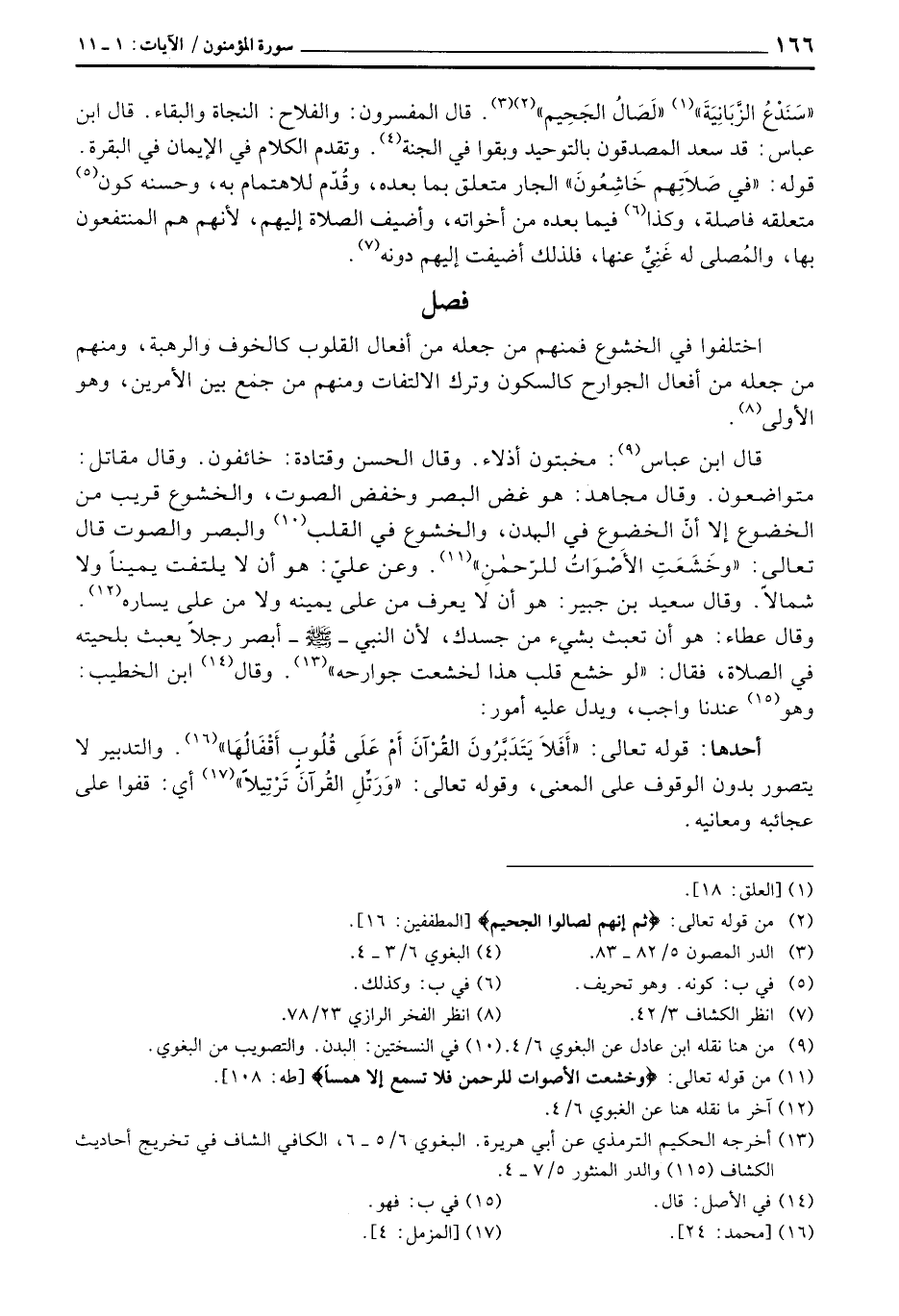 سَندْعُ الزَّبَانِيَةَ» «لَصَالُ الجَحِيم» . قال المفسرون: والفلاح: النجاة والبقاء. قال ابن عباس: قد سعد المصدقون بالتوحيد وبقوا في الجنة. وتقدم الكلام في الإيمان في البقرة. قوله: {الذين هُمْ فِي صَلاَتِهِمْ خَاشِعُونَ} الجار متعلق بما بعده، وقُدّم للاهتمام به، وحسنه كون متعلقه فاصلة، وكذا فيما بعده من أخواته، وأضيف الصلاة إليهم، لأنهم هم المنتفعون بها، والمُصلى له غَنِيٌّ عنها، فلذلك أضيفت إليهم دونه.