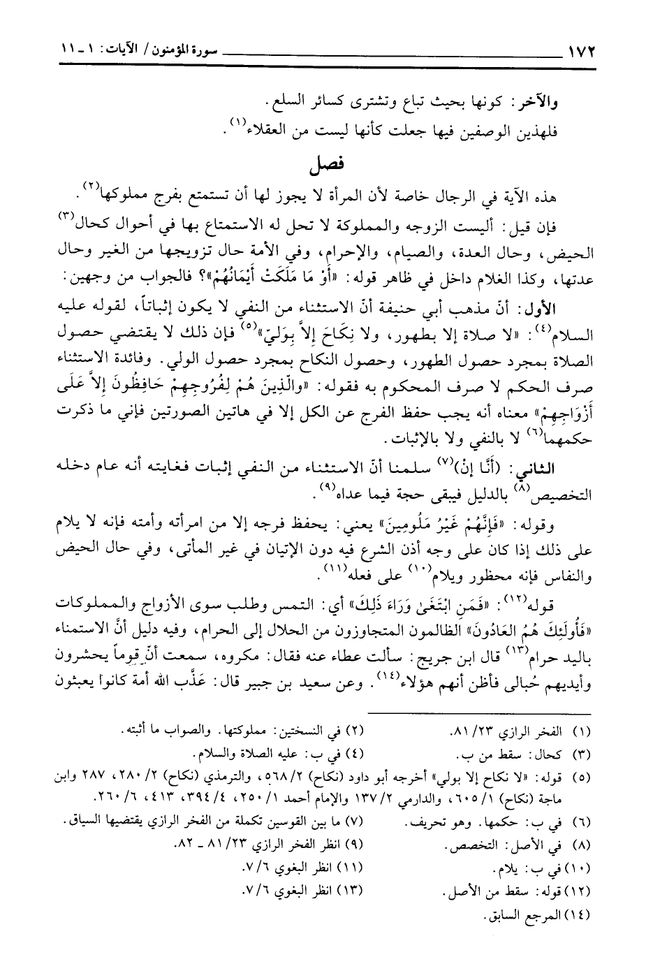 «لا صلاة إلا بطهور، ولا نِكَاحَ إِلاَّ بِوَليّ» فإن ذلك لا يقتضي حصول الصلاة بمجرد حصول الطهور، وحصول النكاح بمجرد حصول الولي. وفائدة الاستثناء صرف الحكم لا صرف المحكوم به فقوله: {والذين هُمْ لِفُرُوجِهِمْ حَافِظُونَ إِلاَّ على أَزْوَاجِهِمْ} معناه أنه يجب حفظ الفرج عن الكل إلا في هاتين الصورتين فإني ما ذكرت حكمهما لا بالنفي ولا بالإثبات.
