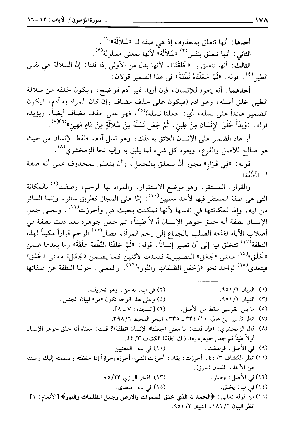 الثالث: أنها تتعلق ب «خَلَقْنَا» ، لأنها بدل من الأولى إذا قلنا: إنّ السلالة هي نفس الطين. قوله: {ثُمَّ جَعَلْنَاهُ نُطْفَةً} في هذا الضمير قولان: