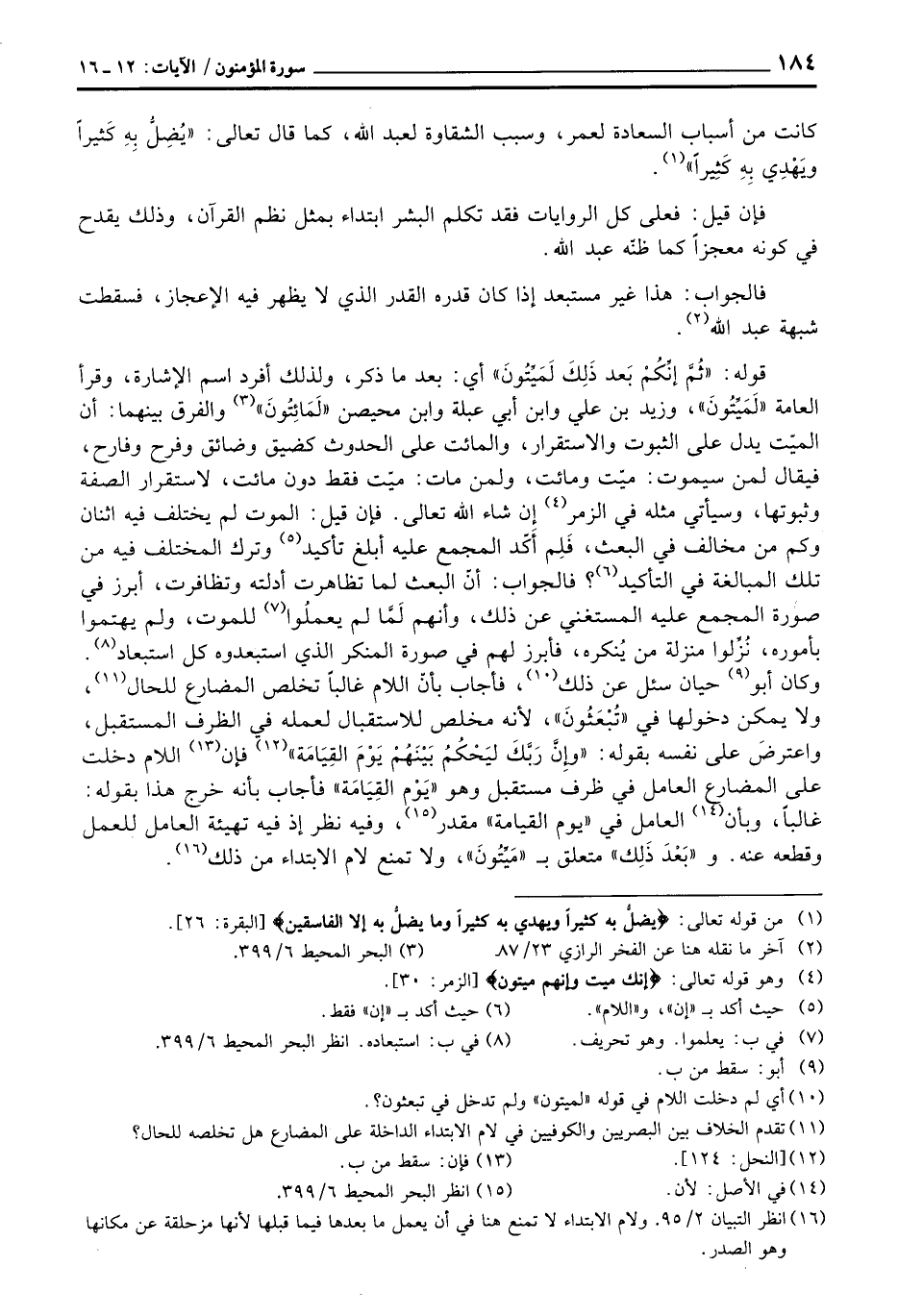 قوله: {ثُمَّ إِنَّكُمْ بَعْدَ ذلك لَمَيِّتُونَ} أي: بعدما ذكر، ولذلك أفرد اسم الإشارة، وقرأ العامة «لَمَيِّتُونَ» ، وزيد بن علي وابن أبي عبلة وابن محيصن «لَمَائِتُونَ» والفرق بينهما: أن الميّت يدل على الثبوت والاستقرار، والمائت على الحدوث كضيق وضائق وفرح وفارح، فيقال لمن سيموت: ميّت ومائت، ولمن مات: ميّت فقط دون مائت، لاستقرار الصفة وثبوتها، وسيأتي مثله في الزمر إن شاء الله تعالى. فإن قيل: الموت لم يختلف فيه اثنان وكم من مخالف في البعث، فَلِم أَكّد المجمع عليه أبلغ تأكيد وترك المختلف فيه من تلك المبالغة في التأكيد؟ فالجواب: أنّ البعث لما تظاهرت أدلته وتظافرت، أبرز في صورة المجمع عليه المستغني عن ذلك، وأنّهم لَمَّا لم يعملُوا للموت، ولم يهتموا بأموره، نُزِّلوا منزلة من يُنكره، فأبرز لهم في صورة المنكر الذي استبعدوه كل استبعاد. وكان أبو حيان سئل عن ذلك، فأجاب أنّ اللام غالباً تخلص المضارع للحال، ولا يمكن دخولها في «تُبْعَثُونَ» ، لأنه مخلص للاستقبال لعمله في الظرف المستقبل، واعترضَ على نفسه بقوله: {وَإِنَّ رَبَّكَ لَيَحْكُمُ بَيْنَهُمْ يَوْمَ القيامة} [النحل: 124] فإن اللام دخلت على المضارع العامل في ظرف مستقبل وهو «يَوْمِ القِيَامَة» فأجاب بأنه خرج هذا بقوله: غالباً، وبأن العامل في «يوم القيامة» مقدر، وفيه نظر إذ فيه تهيئة العامل للعمل وقطعه عنه.