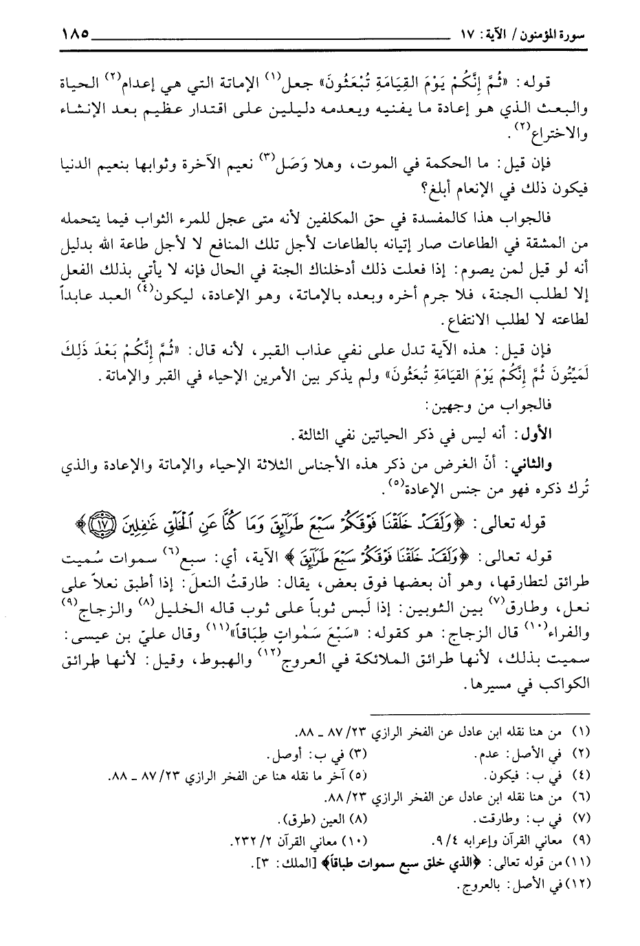 قوله تعالى: {وَلَقَدْ خَلَقْنَا فَوْقَكُمْ سَبْعَ طَرَآئِقَ} الآية، أي: سبع سموات سُميت طرائق لتطارقها، وهو أن بعضها فوق بعض، يقال: طارقتُ النعلَ: إذا أطبق نعلاً على نعل، وطارق بين الثوبين: إذا لَبس ثوباً على ثوب قاله الخليل والزجاج والفراء قال الزجاج: هو كقوله: {سَبْعَ سَمَاوَاتٍ طِبَاقاً} [الملك: 3] وقال عليّ بن عيسى: سميت بذلك، لأنها طرائق الملائكة في العروج والهبوط، وقيل: لأنها طرائق الكواكب في مسيرها.