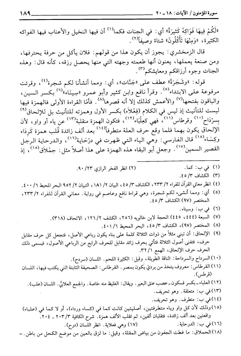 قوله: «وشَجَرَةً» عطف على «جَنَّات» ، أي: ومما أنشأنا لكم شجرة، وقرئت مرفوعة على الابتداء. وقرأ نافع وابن كثير وأبو عمرو «سِينَاء» بكسر السين، والباقون بفتحها والأعمش كذلك إلا أنه قصرها. فأمّا القراءة الأولى فالهمزة فيها ليست للتأنيث إذ ليس في الكلام (فِعْلاَء) بكسر الأول وهمزته للتأنيث بل للإلحاق بِسرْدَاح وقرطاس، فهي كعِلْبَاء، فتكون الهمزة منقلبة عن ياء أو واو، لأن الإلحاق يكون بهما فلما وقع حرف العلة متطرفاً بعد ألف زائدة قُلب همزة كَرِدَاء وكِسَاء قال الفارسي: وهي الياء التي ظهرت في درْحَاية، والدرحاية الرجل القصير السمين. وجعل أبو البقاء هذه الهمزة على هذا أصلاً مثل: حِمْلاَق، إذ