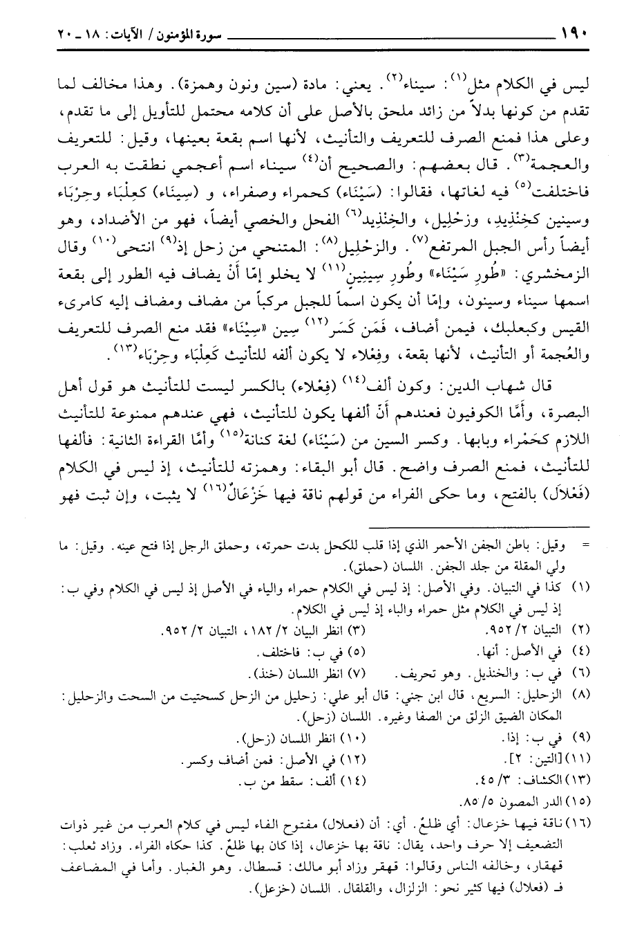 ليس في الكلام مثل: سيناء. يعني: مادة (سين ونون وهمزة) . وهذا مخالف لما تقدم من كونها بدلاً من زائد ملحق بالأصل على أن كلامه محتمل للتأويل إلى ما تقدم، وعلى هذا فمنع الصرف للتعريف والتأنيث، لأنها اسم بقعة بعينها، وقيل: للتعريف والعجمة. قال بعضهم: والصحيح أن سيناء اسم أعجمي نطقت به العرب فاختلفت فيه لغاتها، فقالوا: (سَيْنَاء) كحمراء وصفراء، و (سِينَاء) كعِلْبَاء وحِرْبَاء وسينين كخِنْذِيدِ، وزحْلِيل، والخِنْذِيد الفحل والخصي أيضاً، فهو من الأضداد، وهو أيضاً رأس الجبل المرتفع. والزحْلِيل: المتنحي من زحل إذ انتحى وقال الزمخشري: «طُورِ سَيْنَاء» وطُورِ سِينِينٍ لا يخلو إمّا أَنْ يضاف فيه الطور إلى بقعة اسمها سيناء وسينون، وإمّا أن يكون اسماً للجبل مركباً من مضاف ومضاف إليه كامرئ القيس وكبعلبك، فيمن أضاف، فَمَن كَسَر سِين «سيْنَاء» فقد منع الصرف للتعريف والعُجمة أو التأنيث، لأنها بقعة، وفِعْلاء لا يكون ألفه للتأنيث كَعِلْبَاء وحِرْبَاء.