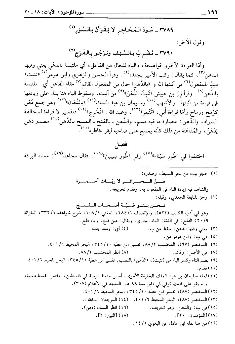 3790 - نَضْرِبُ بالسَّيْفِ ونَرْجُوا بِالفَرَج ... وأمّا القراءة الأخرى فواضحة، والباء للحال من الفاعل، أي ملتبسة بالدهْنِ يعني وفيها الدهن، كما يقال: ركب الأمير بجنده. وقرأ الحسن والزهري وابن هرمز «تنبت» مبنيًّا للمفعول من أنبتها الله و «بالدُّهْنِ» حال من المفعول القائم مقام الفاعل أي: ملتبسة بالدُّهن. وقرأ زِرّ بن حبيش «تُنْبِتُ الدُّهْنَ» من أنبت، وسقوط الباء هنا يدل على زيادتها في قراءة من أثبتها. والأشهب وسليمان بن عبد الملك «بالدِّهَان» وهو جمع دُهْن كرُمْح ورماح وأمّا قراءة أُبّي: «تُتْمِر» ، وعبد الله: «تُخْرِج» فتفسير لا قراءة لمخالفة السواد، والدّهن: عصارة ما فيه دسم، والدَّهن - بالفتح - المسح بالدُّهن مصدر دَهَن يَدْهُنُ، والمُدَاهَنَة من ذلك كأنه يمسح على صاحبه ليقر خاطره.