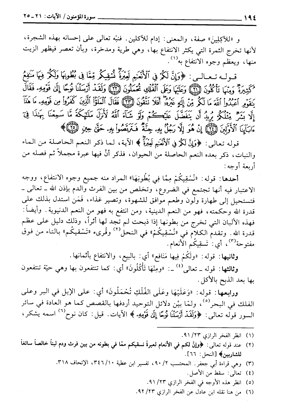 قوله تعالى: {وَإِنَّ لَكُمْ فِي الأنعام لَعِبْرَةً} الآية، لما ذكر النعم الحاصلة من الماء والنبات، ذكر بعده النعم الحاصلة من الحيوان، فذكر أنَّ فيها عبرة مجملاً ثم فصله من أربعة أوجه: