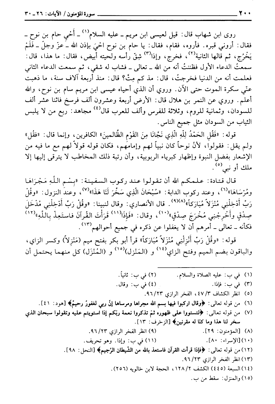 قال قتادة: علمكم الله أن تقولوا عند ركوب السفينة: {بِسْمِ الله مَجْرَاهَا وَمُرْسَاهَا} [هود: 41] ، وعند ركوب الدابة: {سُبْحَانَ الذي سَخَّرَ لَنَا هذا} [الزخرف: 13] ، وعند النزول: {وَقُل رَّبِّ أَنزِلْنِي مُنزَلاً مُّبَارَكاً} . قال الأنصاري: وقال لنبينا: {وَقُل رَّبِّ أَدْخِلْنِي مُدْخَلَ صِدْقٍ وَأَخْرِجْنِي مُخْرَجَ صِدْقٍ}