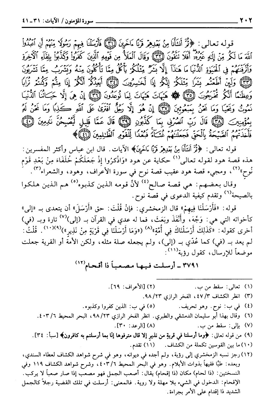 قوله: «فَأَرْسَلْنَا فِيهِمْ» قال الزمخشري: فإنْ قُلْتَ: حق «أَرْسَلَ» أن يتعدى ب «إلى» كأخواته التي هي: وَجَّهَ، وأَنْفَذَ وبَعَثَ، فما له عدي في القرآن ب (إلى) تارة وب (في) أخرى كقوله: {كَذَلِكَ أَرْسَلْنَاكَ في أُمَّةٍ} [الرعد: 30] { (وَمَآ أَرْسَلْنَا فِي قَرْيَةٍ مِّن نَّذِيرٍ) } [سبأ: 34] . قُلْتُ: لم يعد ب (في) كما عُدّي ب (إلى) ، ولم يجعل صلة مثله، ولكن الأمة أو القرية جعلت موضعاً للإرسال، كقول رؤبة:
