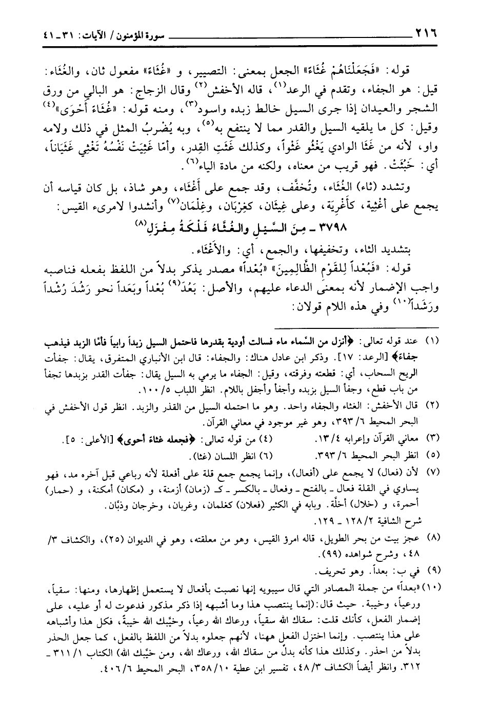 قوله: «فَجَعَلْنَاهُمْ غُثَاءً» الجعل بمعنى: التصيير، و «غُثَاءً» مفعول ثان، والغُثَاء: قيل: هو الجفاء، وتقدم في الرعد، قاله الأخفش وقال الزجاج: هو البالي من ورق الشجر والعيدان إذا جرى السيل خالط زبده واسود، ومنه قوله: «غُثَاءً أَحْوَى» وقيل: كل ما يلقيه السيل والقدر مما لا ينتفع به، وبه يُضْربُ المثل في ذلك ولامه واو، لأنه من غَثَا الوادي يَغْثُوا غَثْواً، وكذلك غَثَتِ القِدر، وأمّا غَثِيَتْ نَفْسُهُ تَغْثِي غَثَيَاناً، أي: خَبُثَتْ. فهو قريب من معناه، ولكنه من مادة الياء.