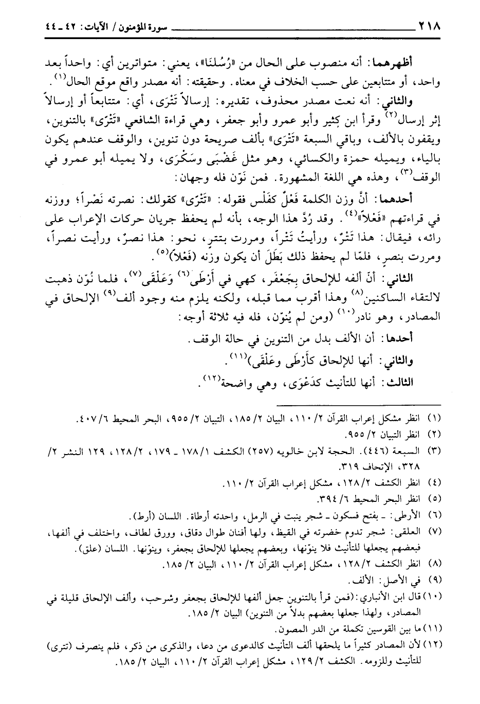والثاني: أنه نعت مصدر محذوف، تقديره: إرسالاً تَتْرَى، أي: متتابعاً أو إرسالاً إثر إرسال وقرأ ابن كثير وأبو عمرو وأبو جعفر، وهي قراءة الشافعي «تَتْرًى» بالتنوين، ويقفون بالألف، وباقي السبعة «تَتْرَى» بألف صريحة دون تنوين، والوقف عندهم يكون بالياء، ويميله حمزة والكسائي، وهو مثل غَضْبَى وسَكْرَى، ولا يميله أبو عمرو في الوقف، وهذه هي اللغة المشهورة. فمن نَوّن فله وجهان:
