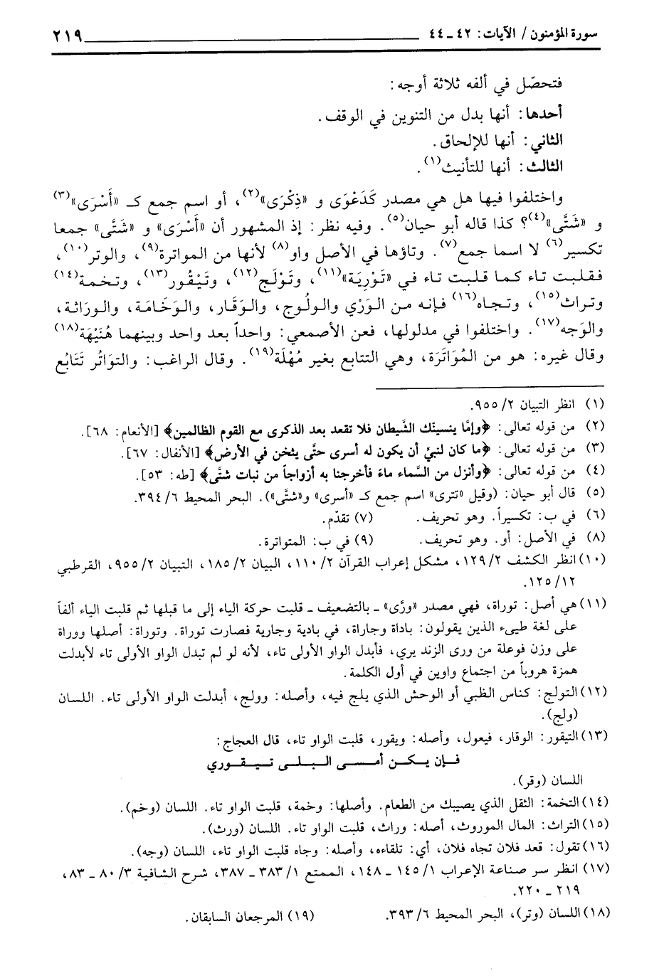 واختلفوا فيها هل هي مصدر كَدَعْوَى و «ذِكْرَى» ، أو اسم جمع ك «أَسْرَى» و «شَتَّى» ؟ كذا قاله أبو حيان. وفيه نظر: إذ المشهور أن «أَسْرَى» و «شَتَّى» جمعا تكسير لا اسما جمع. وتاؤها في الأصل واو لأنها من المواترة، والوتر، فقلبت تاء كما قلبت تاء في «تَوْرِيَة» ، وتَوْلَج، وتَيْقُور، وتخمة وتراث، وتجاه فإنه من الوَرْي والولُوج، والوَقَار، والوَخَامَة، والورَاثة، والوَجه. واختلفوا في مدلولها، فعن الأصمعي: واحداً بعد واحد وبينهما هُنَيْهَة وقال غيره: هو من المُوَاتَرَة، وهي التتابع بغير مُهْلَة.