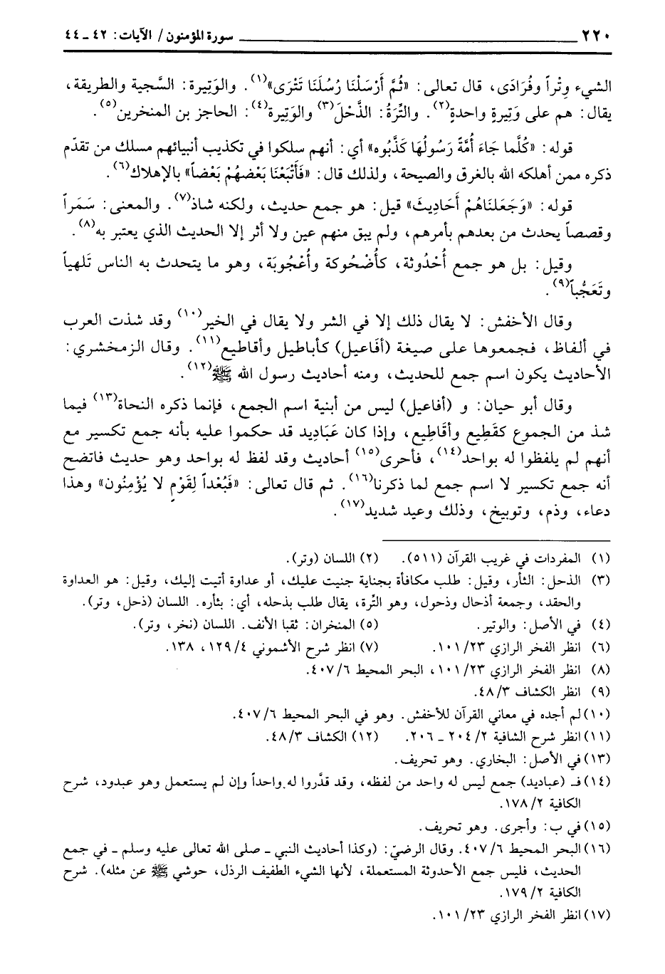 وقال الأخفش: لا يقال ذلك إلا في الشر ولا يقال في الخير وقد شذت العرب في ألفاظ، فجمعوها على صيغة (أفَاعيل) كأباطيل وأقاطيع. وقال الزمخشري: الأحاديث يكون اسم جمع للحديث، ومنه أحاديث رسول الله صَلَّى اللَّهُ عَلَيْهِ وَسَلَّم َ.