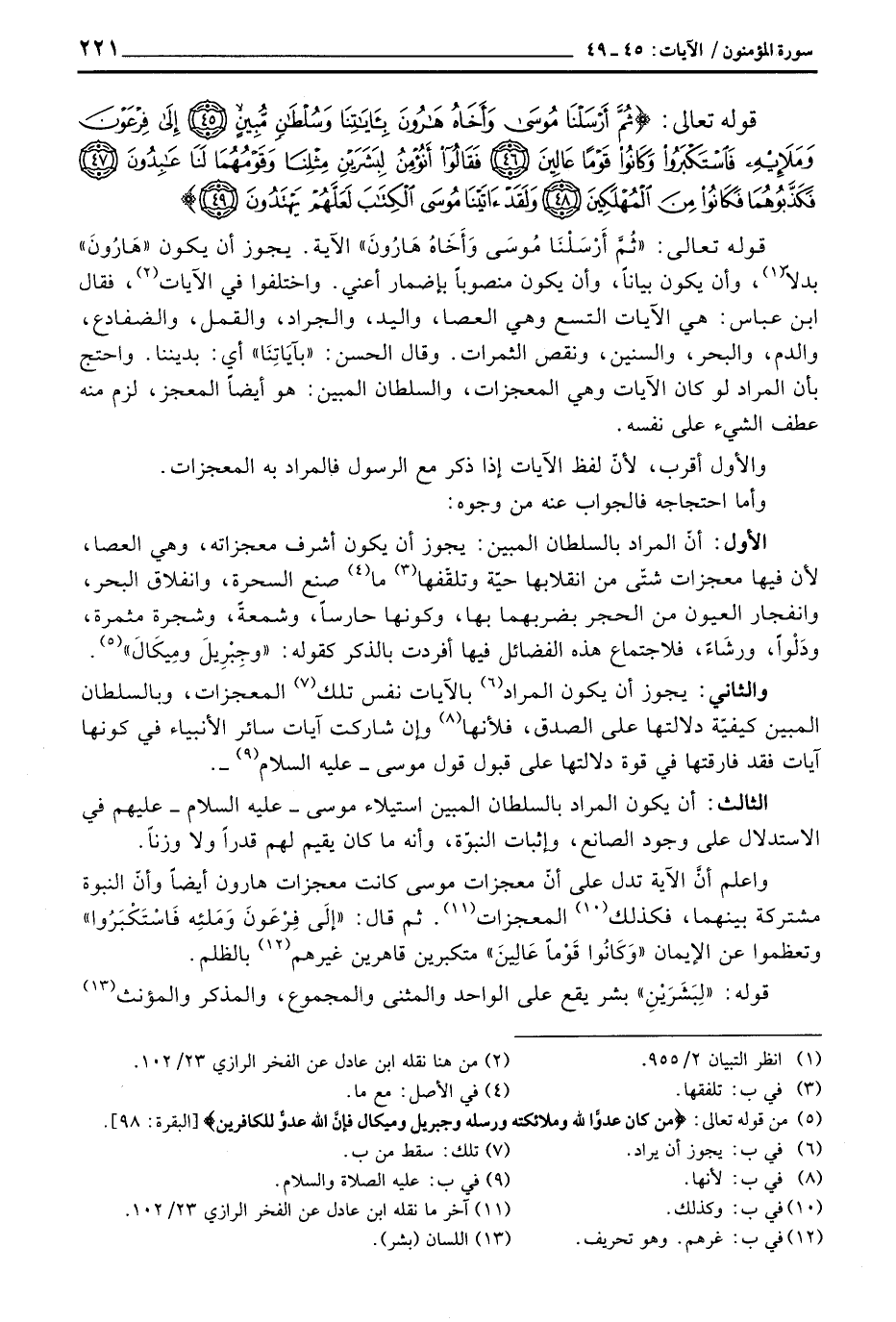 قوله تعالى: {ثُمَّ أَرْسَلْنَا موسى وَأَخَاهُ هَارُونَ} الآية. يجوز أن يكون «هَارُونَ» بدلاً، وأن يكون بياناً، وأن يكون منصوباً بإضمار أعني. واختلفوا في الآيات، فقال ابن عباس: هي الآيات التسع وهي العصا، واليد، والجراد، والقمل، والضفادع، والدم، والبحر، والسنين، ونقص الثمرات. وقال الحسن: «بآيَاتِنَا» أي: بديننا. واحتج بأن المراد لو كان الآيات وهي المعجزات، والسلطان المبين: هو أيضاً المعجز، لزم منه عطف الشيء على نفسه.