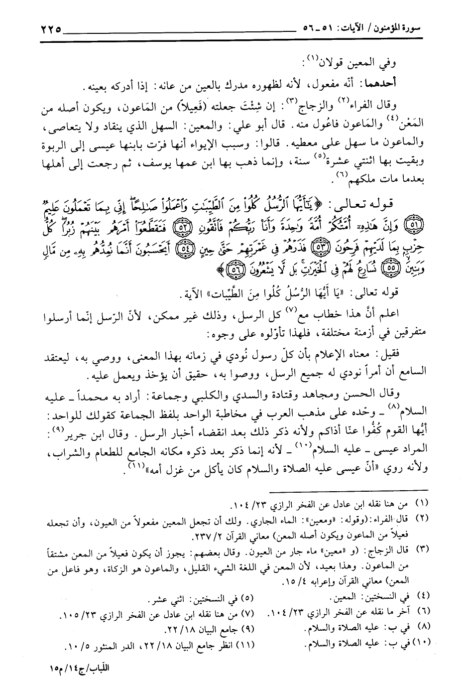 وقال الفراء والزجاج: إن شِئْتَ جعلته (فَعِيلاً) من المَاعون، ويكون أصله من المَعْن والمَاعون فاعُول منه. قال أبو علي: والمعين: السهل الذي ينقاد ولا يتعاصى، والماعون ما سهل على معطيه. قالوا: وسبب الإيواء أنها فرّت بابنها عيسى إلى الربوة وبقيت بها اثنتي عشرة سنة، وإنما ذهب بها ابن عمها يوسف، ثم رجعت إلى أهلها بعدما مات ملكهم.