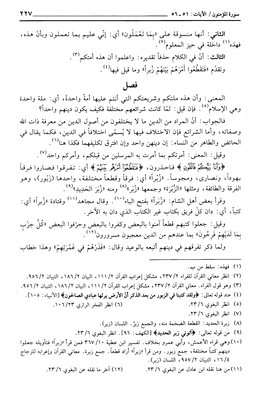 {وَأَنَاْ رَبُّكُمْ فاتقون} فاحذرون، {فتقطعوا أَمْرَهُمْ بَيْنَهُمْ} أي: تفرقوا فصاروا فرقاً يهوداً، ونصارى، ومجوساً. «زُبُراً» أي: فرقاً وقطعاً مختلفة، واحدها (زَبُور) ، وهو الفرقة والطائفة، ومثلها «الزُّبْرَة» وجمعها «زُبَر» ومنه «زُبَرَ الحَدِيدِ» .