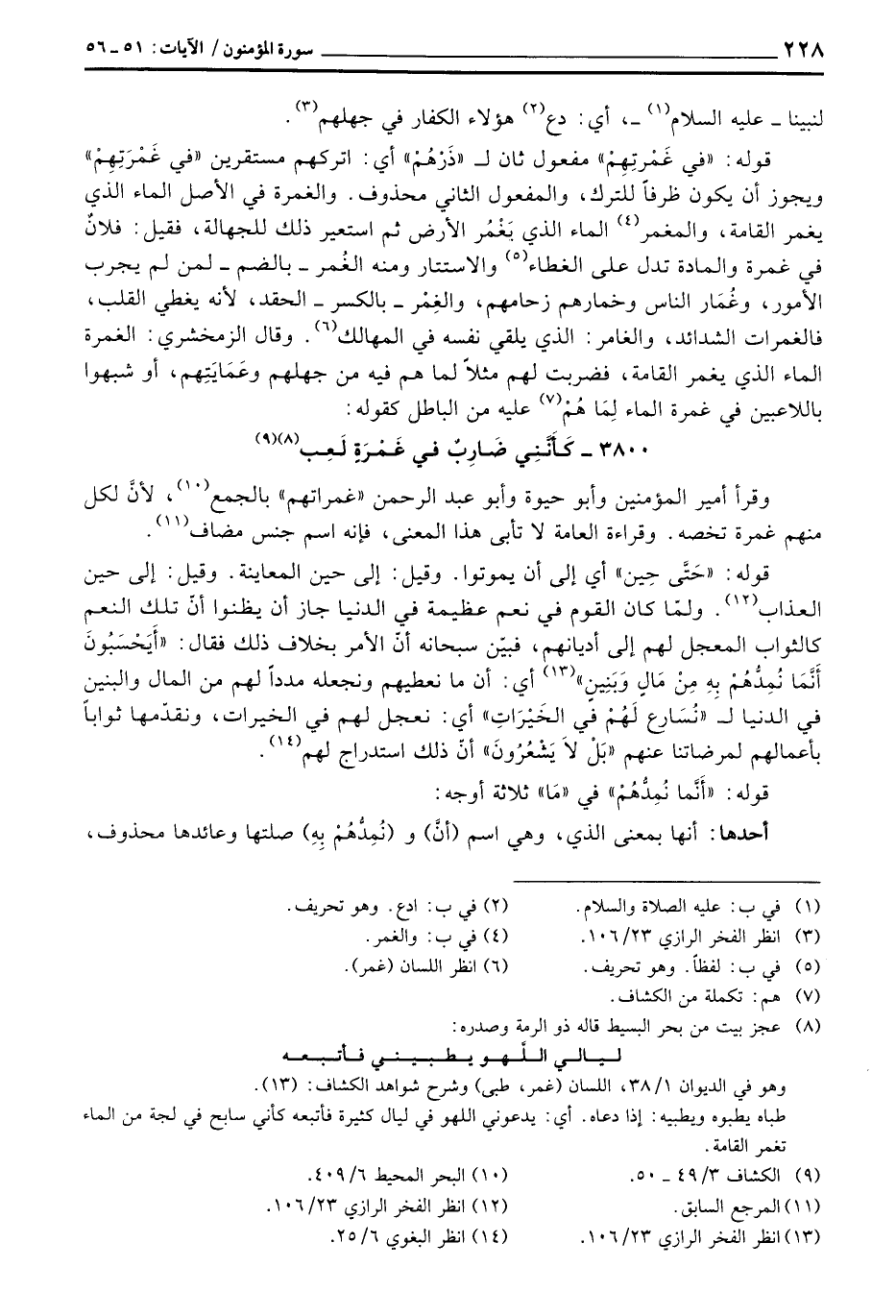 قوله:» حَتَّى حِين «أي إلى أن يموتوا. وقيل: إلى حين المعاينة. وقيل: إلى حين العذاب. ولمّا كان القوم في نعم عظيمة في الدنيا جاز أن يظنوا أنّ تلك النعم كالثواب المعجل لهم إلى أديانهم، فبيّن سبحانه أنّ الأمر بخلاف ذلك فقال: {أَيَحْسَبُونَ أَنَّمَا نُمِدُّهُمْ بِهِ مِن مَّالٍ وَبَنِينَ} أي: أن ما نعطيهم ونجعله مدداً لهم من المال والبنين في الدنيا ل {نُسَارِعُ لَهُمْ فِي الخيرات} أي: نعجل لهم في الخيرات، ونقدّمها ثواباً بأعمالهم لمرضاتنا عنهم {بَل لاَّ يَشْعُرُونَ} أنّ ذلك استدراج لهم.