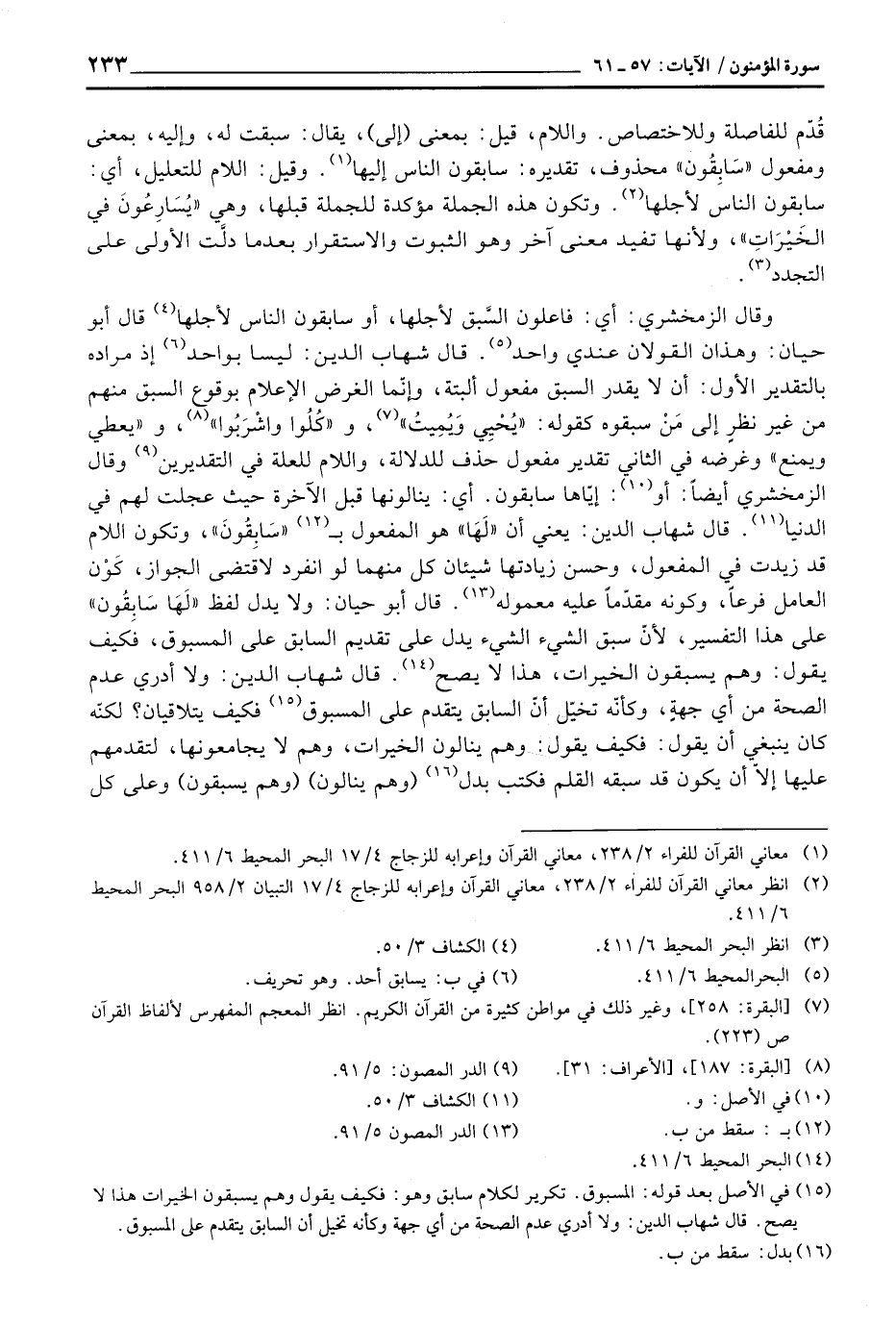 وقال الزمخشري: أي: فاعلون السَّبق لأجلها، أو سابقون الناس لأجلها قال أبو حيان وهذان القولان عندي واحد. قال شهاب الدين: ليسا بواحد إذ مراده بالتقدير الأول: أن لا يقدر السبق مفعول ألبتة، وإنّما الغرض الإعلام بوقوع السبق منهم من غير نظرٍ إلى مَنْ سبقوه كقوله: «يُحْيِي وَيُمِيتُ» ، و «كُلُوا واشْرَبُوا» ، و «يعطي ويمنع» وغرضه في الثاني تقدير مفعول حذف لدلالة، واللام للعلة في التقديرين وقال الزمخشري أيضاً: أو: إيّاها سابقون. أي: ينالونها قبل الآخرة حيث عجلت لهم في الدنيا. قال شهاب الدين: يعني أن «لَهَا» هو المفعول ب «سَابِقُونَ» ، وتكون اللام قد زيدت في المفعول، وحسن زيادتها شيئان كل منهما لو انفرد لاقتضى الجواز، كَوْن العامل فرعاً، وكونه مقدّماً عليه معموله. قال أبو حيان: ولا يدل لفظ «لَهَا سَابِقُون» على هذا التفسير، لأنّ سبق الشيء الشيء يدل على تقديم السابق على المسبوق، فكيف يقول: وهم يسبقون الخيرات، هذا لا يصح. قال شهاب الدين: ولا أدري عدم الصحة من أي جهةٍ، وكأنّه تخيّل أنّ السابق يتقدم على المسبوق فكيف يتلاقيان؟ لكنّه كان ينبغي أن يقول: فكيف يقول: وهم ينالون الخيرات، وهم لا يجامعونها، لتقدمهم عليها إلاّ أن يكون قد سبقه القلم فكتب بدل (وهم ينالون) (وهم يسبقون) وعلى كل