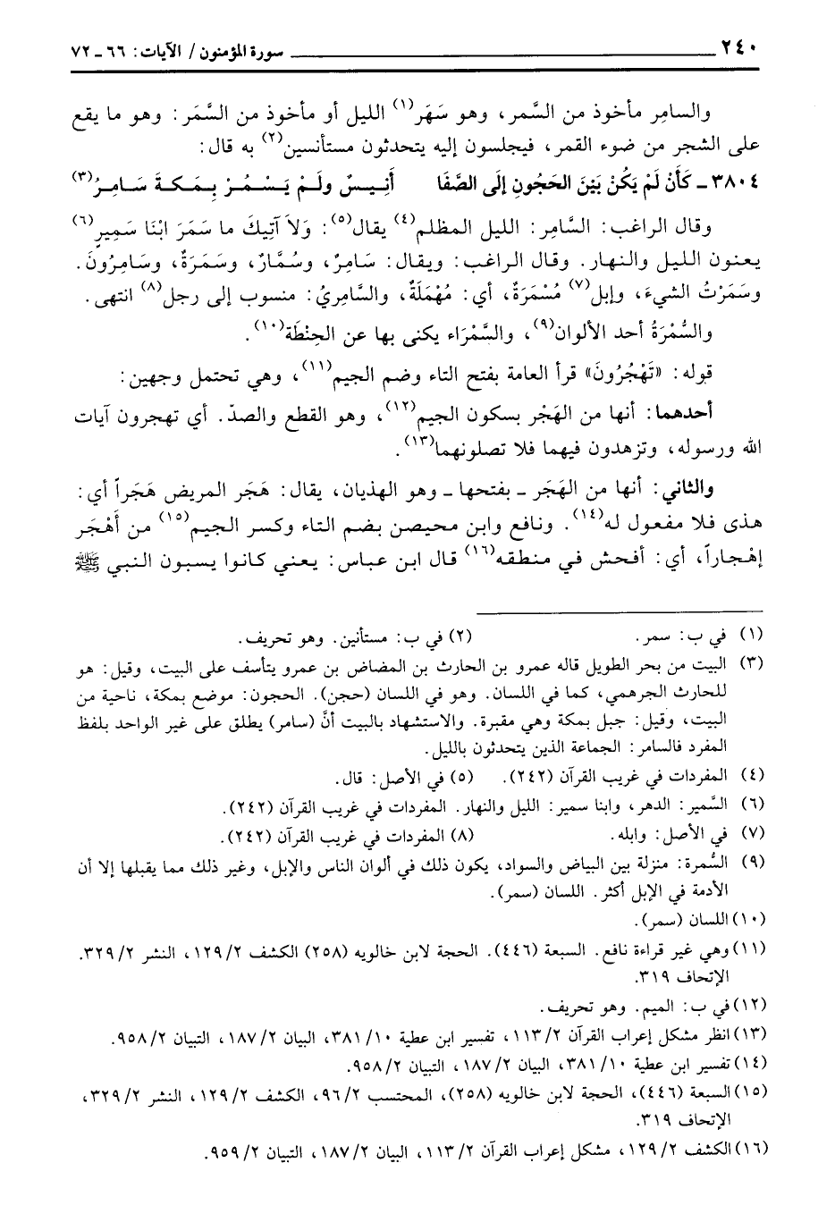 والثاني: أنها من الهَجَر - بفتحها - وهو الهذيان، يقال: هَجَر المريض هَجَراً أي: هذى فلا مفعول له. ونافع وابن محيصن بضم التاء وكسر الجيم من أَهْجَر إهْجاراً، أي: أفحش في منطقه قال ابن عباس: يعني كانوا يسبون النبي صَلَّى اللَّهُ عَلَيْهِ وَسَلَّم َ