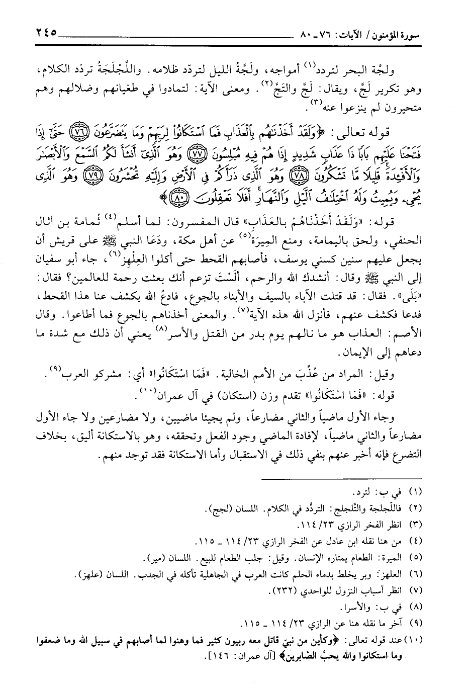 قوله: {وَلَقَدْ أَخَذْنَاهُمْ بالعذاب} قال المفسرون: لما أسلم ثُمامة بن أثال الحنفي، ولحق باليمامة، ومنع المِيرَة عن أهل مكة، ودَعَا النبي صَلَّى اللَّهُ عَلَيْهِ وَسَلَّم َ على قريش أن يجعل عليهم سنين كسني يوسف، فأصابهم القحط حتى أكلوا العِلْهِز، جاء أبو سفيان إلى النبي صَلَّى اللَّهُ عَلَيْهِ وَسَلَّم َ وقال: أنشدك الله والرحم، ألَسْتَ تزعم أنك بعثت رحمة للعالمين؟ فقال: «بَلَى» . فقال: قد قتلت الآباء بالسيف والأبناء بالجوع، فادعُ الله يكشف عنا هذا القحط، فدعا فكشف عنهم، فأنزل الله هذه الآية. والمعنى أخذناهم بالجوع فما أطاعوا. وقال الأصم: العذاب هو ما نالهم يوم بدر من القتل والأسر يعني أن ذلك مع شدة ما دعاهم إلى الإيمان.
