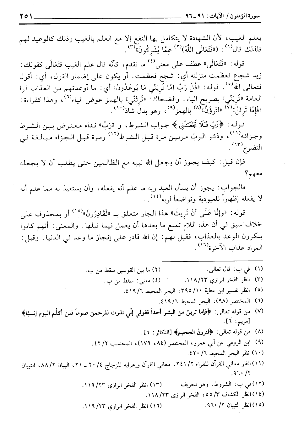 قوله: «فَتَعَالَى» عطف على معنى ما تقدم، كأنّه قال علم الغيب فتَعَالَى كقولك: زيد شجاع فعظمت منزلته أي: شجع فعظمت. أو يكون على إضمار القول، أي: أقول فتعالى الله. قوله: {قُل رَّبِّ إِمَّا تُرِيَنِّي مَا يُوعَدُونَ} أي: ما أوعدتهم من العذاب قرأ العامة «تُرِيَنِّي» بصريح الياء. والضحاك: «تُرِئَنِّي» بالهمز عوض الياء، وهذا كقراءة: «فَإِمَّا تَرِئَنَّ» «لتَرؤُنَّ» بالهمز، وهو بدل شاذ.