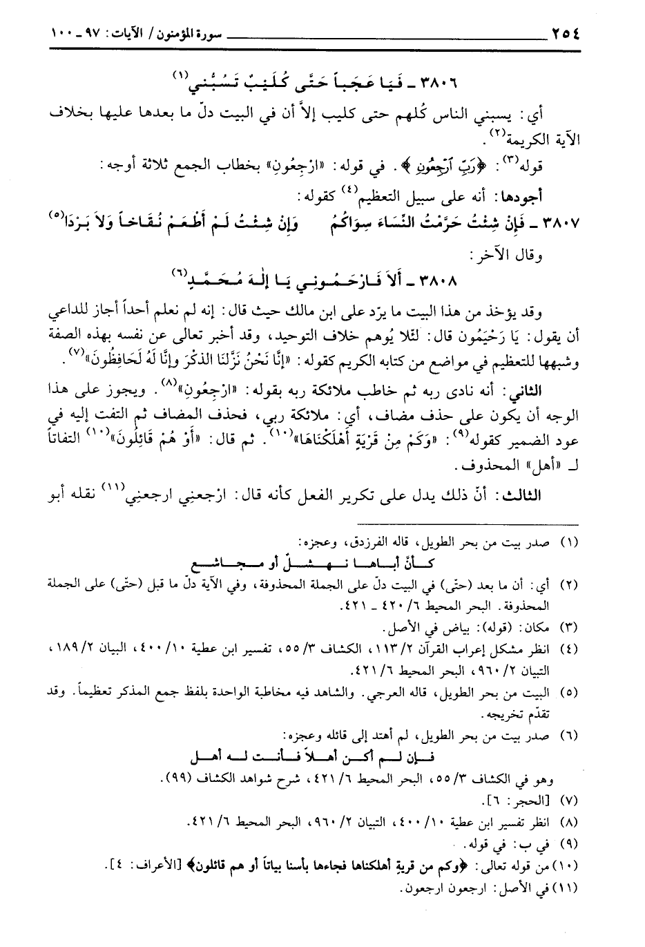3808 - أَلاَ فَارْحَمُونِي يَا إلهَ مُحَمَّدٍ ... وقد يؤخذ من هذا البيت ما يرّد على ابن مالك حيث قال: إنه لم نعلم أحداً أجاز للداعي أن يقول: يَا رَحْيَمُون قال: لئّلا يُوهم خلاف التوحيد، وقد أخبر تعالى عن نفسه بهذه الصفة وشبهها للتعظيم في مواضع من كتابه الكريم كقوله: {إِنَّا نَحْنُ نَزَّلْنَا الذكر وَإِنَّا لَهُ لَحَافِظُونَ} [الحجر: 9] .